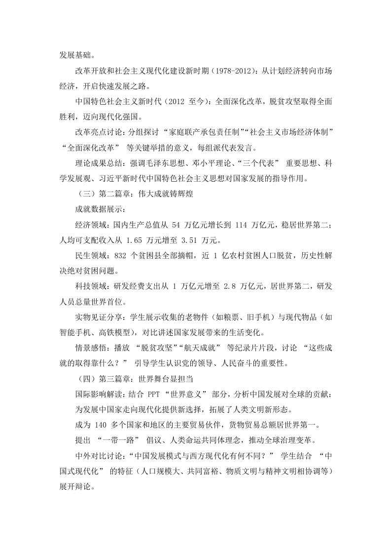 【通用】国庆节主题班会《我和我的祖国》有ppt晨晨老师2个月前发布关注私信15.33KB4页04512 以下为资料部分截图预览,下载后为超高清原文件。 第1页 / 共4页 第2页 / 共4页 试读已结束,还剩2页,您可下载完整版后进行离线阅读 加入VIP,享海量教务资料,无限制免费下载所有材料 【通用】国庆节主题班会《我和我的祖国》有ppt此内容为付费资源,请付费后查看¥9.99¥15.99VIP会员免费代理(享70%分佣)免费立即购买您当前未登录!建议登陆后购买,可保存购买订单付费资源© 版权声明文章版权归作者所有,未经允许请勿转载。THE END综合资料 文本预览 《我和我的祖国》国庆节主题班会教案一、教学目标让学生了解中华人民共和国成立76年来的光辉历程、伟大成就及世界意义,掌握“中国式现代化”的核心内涵,能说出至少3项国家重大发展成果。通过视频观看、小组讨论、成果展示等活动,培养学生的历史思辨能力和信息整合能力,引导学生从多角度认识国家发展。激发学生的爱国热情和民族自豪感,树立“强国有我”的责任意识,将个人成长与国家发展相结合。二、教学重点与难点教学重点:使学生深刻理解新中国成立以来的历史性成就和变革,认识中国特色社会主义道路的正确性。教学难点:引导学生将国家发展与个人实践相联系,理解“中国式现代化”的时代意义,转化为学习和生活中的实际行动。三、教学准备多媒体设备:用于播放PPT、国庆阅兵视频、国家发展成就纪录片片段等。材料准备:打印国家发展时间轴、成就数据卡片:准备红色卡纸、彩笔,供学生制作“强国心愿卡”:提前收集学生参与爱国活动的照片或视频。人员安排:选一名学生担任主持人:邀请历史教师作为特邀嘉宾,协助解读历史事件:安排3-4名学生准备分享“我与祖国的故事”。四、教学过程(一)导入:共庆华诞,同升国旗播放国庆天安门升旗仪式视频,全体学生起立行注目礼,齐唱国歌。主持人发言:“76年前的10月1日,毛泽东主席在天安门城楼上庄严宣告中华人民共和国成立,中国从此站起来了。今天,我们齐聚一堂,以‘我和我的祖国’为主题,共同回顾辉煌历程,展望美好未来,为祖国母亲庆生。”(二)第一篇章:光辉历程照初心历史脉络梳理:展示PPT中“光辉历程”部分,特邀嘉宾结合时间轴讲解新中国发展阶段:社会主义革命和建设时期(1949-1978):确立社会主义基本制度,奠定国家 查看更多 收起部分 喜欢就支持一下吧点赞12 分享QQ空间微博QQ好友海报分享复制链接收藏