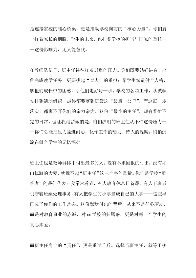 班主任节启动仪式,校长致辞:匠心塑底色,微芒竞出色晨晨老师2个月前发布关注私信12.81KB4页0337 以下为资料部分截图预览,下载后为超高清原文件。 第1页 / 共4页 第2页 / 共4页 试读已结束,还剩2页,您可下载完整版后进行离线阅读 加入VIP,享海量教务资料,无限制免费下载所有材料 班主任节启动仪式,校长致辞:匠心塑底色,微芒竞出色此内容为付费资源,请付费后查看¥9.99¥15.99VIP会员免费代理(享70%分佣)免费立即购买您当前未登录!建议登陆后购买,可保存购买订单付费资源© 版权声明文章版权归作者所有,未经允许请勿转载。THE END综合资料 文本预览 班主任节启动仪式,校长致辞:匠心塑底色,微芒竞出色尊敬的各位班主任、老师们,亲爱的同学们:下午好!今天,我们又一次怀着敬意与温暖,迎来属于我们xx学校的班主任节。此刻,请允许我代表学校,也代表每一位被你们守护的学生,向全体班主任致以最热烈的祝贺!感谢你们用汗水浇灌学校的发展之路,感谢你们始终与学校并肩同行;也请大家务必代为转达一一我向你们的家人,致以最诚挚的问候与感谢!我们都知道,人生成长路上,父母与老师是最重要的引路人。有研究指出,当孩子踏入校园,父母的教育影响会随成长慢慢沉淀,而老师的引导力却在日常点滴中愈发凸显。人这一生,或许会遇见60到80位老师,但在这数十份师恩里,对成长轨迹影响最深、留下印记最久的,往往是班主任。人们常说,班主任是“天底下最小的主任”,可这份“小”里,装着最能吃苦的韧劲、最愿付出的热忱,也藏着最不计回报的真心。你们是班级秩序的组织者、班集体灵魂的塑造者,是引着学生向阳生长、伴他们德智体美劳全面发展的人生导师:是学校德育工作的中坚骨干, 查看更多 收起部分 喜欢就支持一下吧点赞7 分享QQ空间微博QQ好友海报分享复制链接收藏