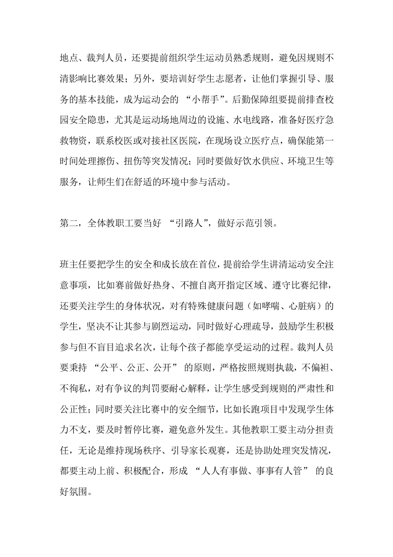 学校运动会部署会上,校长讲话_:细抓实抓运动会筹备,护航学生健康成长晨晨老师2个月前发布关注私信13.36KB4页0447 以下为资料部分截图预览,下载后为超高清原文件。 第1页 / 共4页 第2页 / 共4页 试读已结束,还剩2页,您可下载完整版后进行离线阅读 加入VIP,享海量教务资料,无限制免费下载所有材料 学校运动会部署会上,校长讲话_:细抓实抓运动会筹备,护航学生健康成长此内容为付费资源,请付费后查看¥9.99¥15.99VIP会员免费代理(享70%分佣)免费立即购买您当前未登录!建议登陆后购买,可保存购买订单付费资源© 版权声明文章版权归作者所有,未经允许请勿转载。THE END综合资料 文本预览 学校运动会部署会上,校长讲话:细抓实抓运动会筹备,护航学生健康成长各位老师、同志们:今天我们召开运动会部署会,核心是把各项工作落细落实,既要让孩子们在运动中感受快乐、收获成长,也要确保整个活动安全、有序、高效。首先,我想和大家明确一点:学校运动会不只是“跑一跑、跳一跳”的竞技活动,更是践行“健康第一”教育理念、培养学生意志品质与团队精神的重要课堂。所以,从筹备到执行的每一个环节,都要围绕“育人”这个核心,把责任扛起来、把细节做到位。第一,各部门要拧成“一股绳”,压实协作责任。德育处要牵头做好整体统筹,提前制定详细的活动方案,包括开幕式流程、班级入场秩序、观赛纪律要求,尤其要抓好学生的思想动员一一让孩子们明白,运动会不仅是运动员的舞台,更是每个班级展现凝聚力的机会,文明观赛、为他人喝彩同样是“胜利”。教务处要做好教学协调,合理调整运动会期间的课程安排,确保不影响正常教学秩序,同时提醒任课教师主动参与班级管理,协助班主任做好学生组织工作。体育组是关键力量,要精准完成场地器材准备,比如检查跑道平整度、运动器械安全性,细化赛程安排,明确每个项目的时间、 查看更多 收起部分 喜欢就支持一下吧点赞7 分享QQ空间微博QQ好友海报分享复制链接收藏