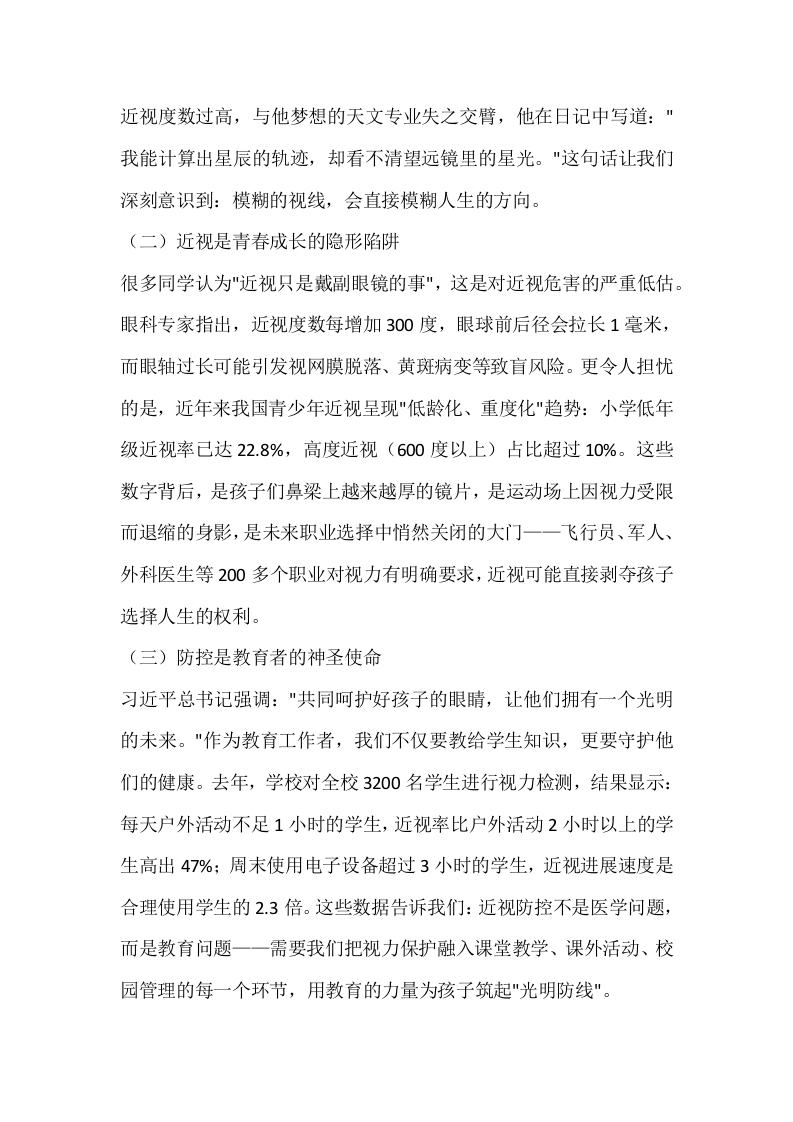 校长在近视防控宣传教育月活动上讲话:擦亮心灵之窗,守护成长之光晨晨老师2个月前发布关注私信17.93KB8页0356 以下为资料部分截图预览,下载后为超高清原文件。 第1页 / 共8页 第2页 / 共8页 试读已结束,还剩6页,您可下载完整版后进行离线阅读 加入VIP,享海量教务资料,无限制免费下载所有材料 校长在近视防控宣传教育月活动上讲话:擦亮心灵之窗,守护成长之光此内容为付费资源,请付费后查看¥9.99¥15.99VIP会员免费代理(享70%分佣)免费立即购买您当前未登录!建议登陆后购买,可保存购买订单付费资源© 版权声明文章版权归作者所有,未经允许请勿转载。THE END校长讲话 文本预览 校长在近视防控宜传教育月活动上讲话:擦亮心灵之窗,守护成长之光尊敬的各位同仁、亲爱的同学们:大家上午好!当清晨的阳光洒满操场,当五星红旗在风中舒展,当我们用双眼捕捉这动人的瞬间时,可曾想过:这扇"心灵之窗"正悄然蒙尘?去年校庆时,我收到一位校友的来信,信中写道:"母校教会我知识,却没能教会我保护视力一一如今我站在手术台前,显微镜下的世界始终模糊,这成了我从医路上最大的遗憾。"这番话让我深感痛心:教育如果只关注分数的增长,却忽视了视力的守护,便是舍本逐末的教育。今天,我们以"视力健康守护月"为契机,共同探讨如何为青春擦亮双眼,为未来守护光明。我将从"为何守护"如何守护"谁来守护"三个维度,与大家一起构建视力健康的"防护网",让每个孩子都能用清澈的眼眸,看见更远的世界,追逐更亮的梦想。一、为何守护明眸:视力健康的价值重构(一)眼晴是感知世界的第一扇门医学研究表明,人类80%的知识获取依赖视觉,90%的情感体验源于视觉。当我们还是襁褓中的婴儿,是眼睛第一次让我们认出母亲的笑脸;当我们走进课堂,是眼晴带我们穿越文字的海洋;当我们走向社会,是眼晴帮我们捕捉机遇的信号。视力,不仅是生理功能的体现,更是生命质量的基石。去年我校高三(2)班的李明同学,因先天性 查看更多 收起部分 喜欢就支持一下吧点赞6 分享QQ空间微博QQ好友海报分享复制链接收藏