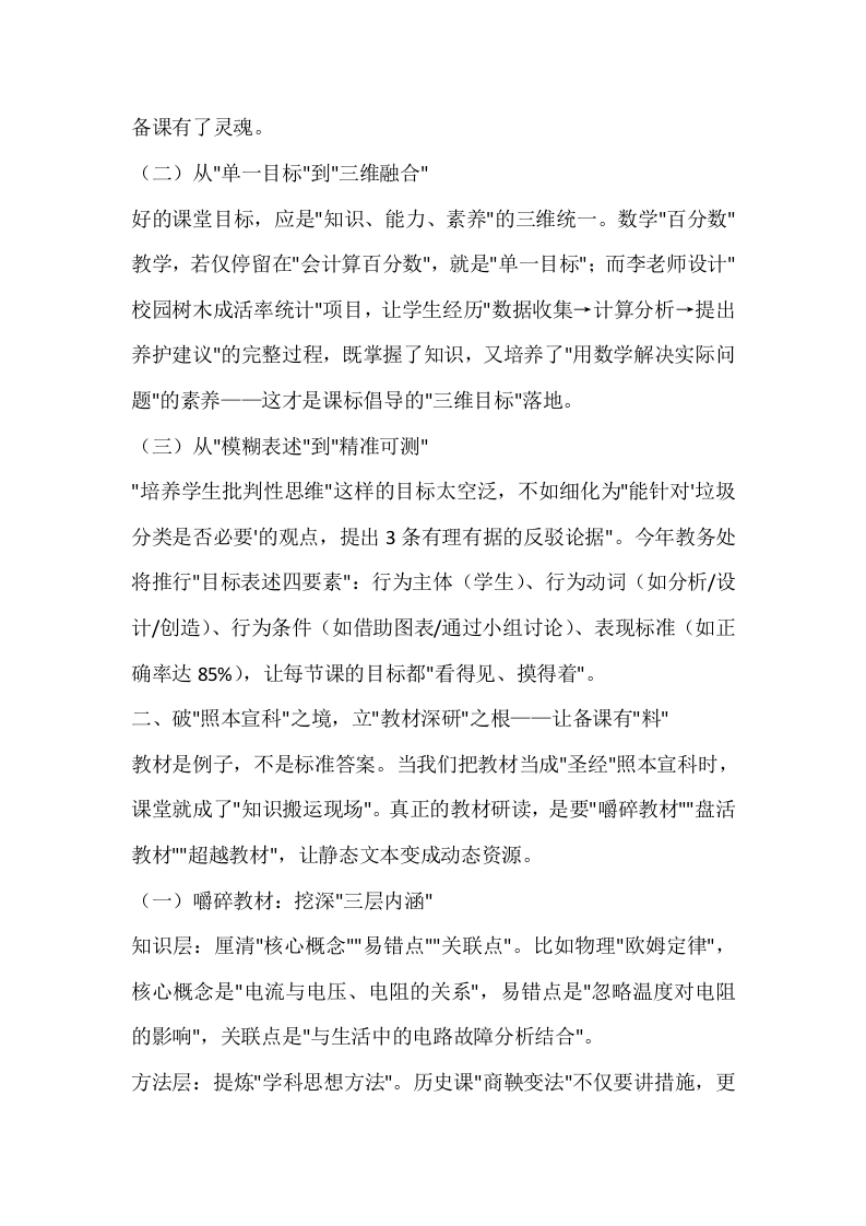 分管教学副校长在全体教师会上发言:备课的破与立晨晨老师2个月前发布关注私信17.67KB8页0435 以下为资料部分截图预览,下载后为超高清原文件。 第1页 / 共8页 第2页 / 共8页 试读已结束,还剩6页,您可下载完整版后进行离线阅读 加入VIP,享海量教务资料,无限制免费下载所有材料 分管教学副校长在全体教师会上发言:备课的破与立此内容为付费资源,请付费后查看¥9.99¥15.99VIP会员免费代理(享70%分佣)免费立即购买您当前未登录!建议登陆后购买,可保存购买订单付费资源© 版权声明文章版权归作者所有,未经允许请勿转载。THE END校长讲话 文本预览 分管教学副校长在全体教师会上发言:备课的破与立各位老师,大家好!新学期的铃声已经敲响,当我们再次站在备课台前,是否曾问过自己:为什么同样的40分钟,有的课堂让学生意犹未尽,有的却让学生昏昏欲睡?为什么同样的教材内容,有的老师能教出思维的火花,有的却只能传递冰冷的知识?今天,我想和大家探讨一个核心命题一一备课的"破"与"立":既要打破"经验主义"照本宣科"单向灌输"的旧模式,更要建立"以生为本"深度研析"灵动创新"的新逻辑。这条路或许充满挑战,但当我们真正实现从"备教材"到"备成长"、从"备教案"到"备生命"的蜕变,课堂必将焕发前所未有的生命力。一、破"目标模糊"之困,立"方向锚定"之魂一一让备课有"纲没有方向的努力,都是徒劳。不少老师备课习惯于"翻开教材就写教案",却忽略了课标这一"根本遵循"。去年我们对毕业班教案调研发现:41%的教案未明确课标对应点,导致"教什么"与"学什么"脱节。备课的第一重突破,就是要让"课标意识"扎根内心。(一)从"被动执行"到主动解码”课标不是"纸上条文",而是"育人蓝图"。语文组王老师备《红楼梦》专题课时,没有直接讲解人物关系,而是从课标"初步鉴赏文学作品要求出发,设计"林黛玉进贾府的3处礼仪细节"对比分析活动,让学生在文本细读中体会"封建社会等级制度"。这种"课标解码"能力,让 查看更多 收起部分 喜欢就支持一下吧点赞5 分享QQ空间微博QQ好友海报分享复制链接收藏