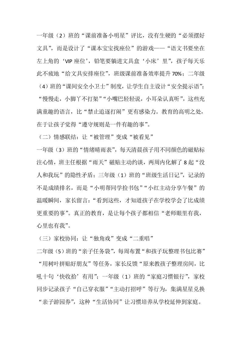 小学教学副校长在班主任工作会议讲话:低段班级管理的“温柔法则”——当教育变成孩子的“主动选择”晨晨老师2个月前发布关注私信18.36KB9页03510 以下为资料部分截图预览,下载后为超高清原文件。 第1页 / 共9页 第2页 / 共9页 试读已结束,还剩7页,您可下载完整版后进行离线阅读 加入VIP,享海量教务资料,无限制免费下载所有材料 小学教学副校长在班主任工作会议讲话:低段班级管理的“温柔法则”——当教育变成孩子的“主动选择”此内容为付费资源,请付费后查看¥9.99¥15.99VIP会员免费代理(享70%分佣)免费立即购买您当前未登录!建议登陆后购买,可保存购买订单付费资源© 版权声明文章版权归作者所有,未经允许请勿转载。THE END校长讲话 文本预览 小学教学副校长在班主任工作会议讲话:低段班级管理的“温柔法则”一一当教育变成孩子的“主动选择”各位班主任同仁:大家下午好!今天我们相聚在这里,共同探讨一个核心命题:如何让低段班级管理从“老师推着走”变成“孩子主动跑”。小学低段是习惯养成的“塑形期”,也是情感培育的“生根期”,传统的“说教式管理”往往事倍功半,而真正的教育智慧,在于用“温柔的法则”唤醒孩子内心的成长动力。开学一个多月来,大家用“蹲下来说话”的耐心、“牵着手引导”的细心,让校园里充满了“小大人”般的担当一一一年级孩子主动帮老师整理讲台,二年级学生自发组织“图书管理员”轮岗,这些细节印证了一个真理:当教育触及心灵,孩子会比我们想象的更优秀。在此,我代表学校教学管理团队,向各位“用爱浇灌成长”的班主任们致敬!一、看见“温柔的力量”:那些藏在细节里的育人智慧回顾这段时间的班级管理实践,许多班主任已经用“温柔法则”交出了精彩答卷,这些做法的共同特质是:把“要求”变成“邀请”,把“约束”变成“期待”,把“被动接受”变成“主动参与”。(一)规则内化:让“要我做”变成“我要做” 查看更多 收起部分 喜欢就支持一下吧点赞10 分享QQ空间微博QQ好友海报分享复制链接收藏
