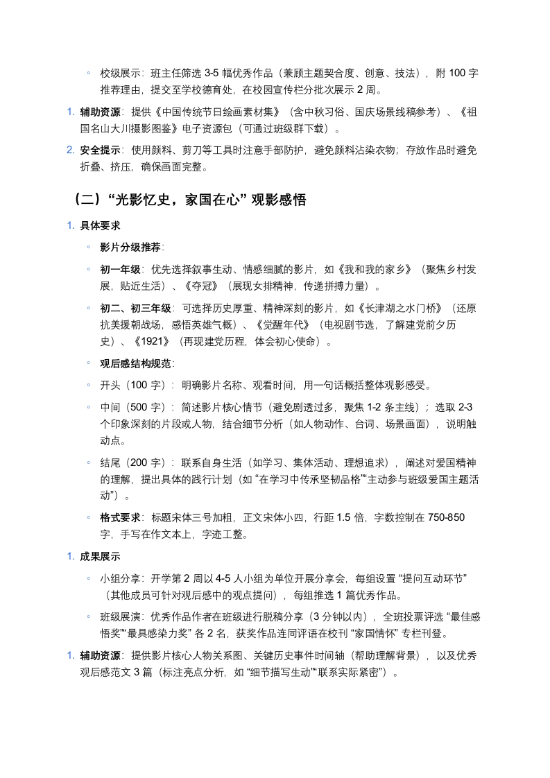 国庆中秋德育作业一、作业主题“情系中秋,礼赞国庆一一传承家国情怀,展现青春担当”二、作业目标1.文化认知目标:深入掌握中秋起源、习俗(如祭月、赏月、吃月饼等)的文化寓意,明晰国庆的历史背景(新中国成立历程)与时代价值,能准确阐述两个节日承载的家国情怀关联,民族自豪感与文化自信显著提升。2.能力培养目标:通过绘画、写作、手工、实践等多元活动,熟练运用至少1种艺术创作形式,提升文字表达的逻辑性与感染力,增强动手实操、团队协作及社会沟通能力,创新思维得到有效激发。3.情感实践目标:主动以实际行动践行感恩家庭、热爱祖国的理念,形成对中华优秀传统文化的自觉传承意识,树立初步的社会责任感与青春担当精神。三、作业内容(含细化要求、辅助说明与安全提示)(一)“绘梦中华,月映家国”绘画创作1.具体要求。主题方向:可从“山河之美”(如长城日出、漓江月夜、城市地标与圆月同框)、“庆典之盛”(如国庆阅兵片段、社区升旗仪式、校园国庆板报)、“团圆之暖”(如全家围坐分月饼、祖辈讲述中秋故事、视频连线送中秋祝福)、“传承之光”(如非遗手艺人制作中秋花灯、红色景点与传统民俗结合)四大方向切入。。创作规范:绘画形式不限(油画、水彩、素描、漫画、彩铅、国画等均可),纸张统一为A3,作品需标注姓名、班级及50字以内的作品名称与主题阐释(写在作品背面右下角)。。时间建议:假期第1-3天确定主题并构思草图,第46天完成创作,预留1天修改完善。1.成果展示。班级展览:开学第1周班会课举办“绘梦家国”主题展,设置“作品讲解环节”(每人12分钟,重点说明创作灵感、画面元素寓意)。