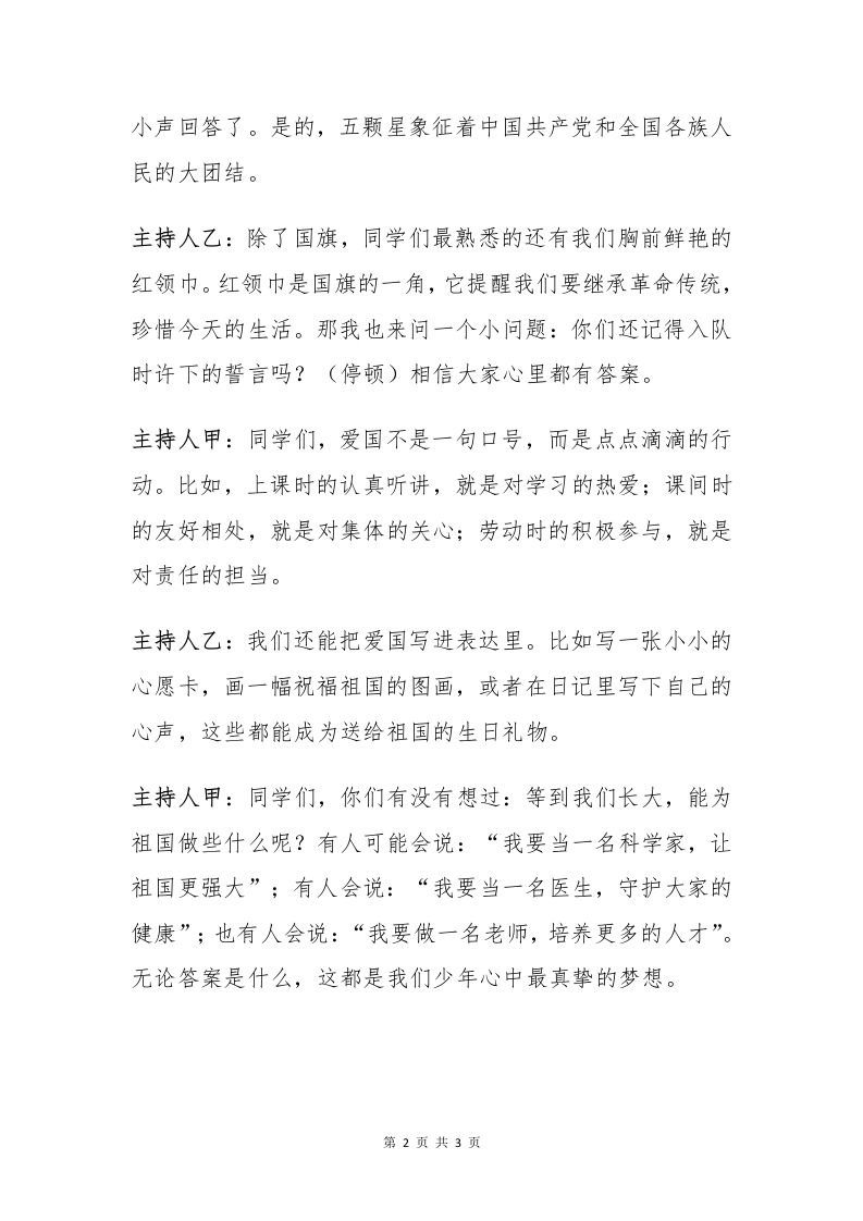 2025年国庆节红领巾广播稿晨晨老师2个月前发布关注私信0.17MB3页05014 以下为资料部分截图预览,下载后为超高清原文件。 第1页 / 共3页 第2页 / 共3页 试读已结束,还剩1页,您可下载完整版后进行离线阅读 加入VIP,享海量教务资料,无限制免费下载所有材料 2025年国庆节红领巾广播稿此内容为付费资源,请付费后查看¥9.99¥15.99VIP会员免费代理(享70%分佣)免费立即购买您当前未登录!建议登陆后购买,可保存购买订单付费资源© 版权声明文章版权归作者所有,未经允许请勿转载。THE END重要节日 文本预览 2025年国庆节红领巾广播稿一七十六载春秋路,少年丹心映征途主持人甲:亲爱的老师们、同学们,大家早上好!这里是红领巾广播站,我是今天的主持人XX。主持人乙:我是主持人XX。今天,我们的校园洋溢着节日的气息,因为再过不久,我们将迎来中华人民共和国七十六周年的生日!主持人甲:是啊,每年的十月一日,国庆节,不仅是举国欢庆的日子,更是我们少年儿童表达热爱和祝福的重要时刻。你们知道吗?今年还有一个特殊的意义一一这是中国人民抗日战争胜利八十周年的纪念节点。主持人乙:同学们,请大家想一想,当第一面五星红旗在天安门广场升起时,那是怎样的场景?(停顿两秒)对了,那是全国人民无比激动和自豪的时刻。七十六年来,我们的祖国发生了翻天覆地的变化,而这些变化,正是无数先辈用辛勤和智慧换来的。主持人甲:说到这里,我想考考大家:五星红旗上的五颗星分别代表什么呢?(停顿,稍作等待)相信有的同学已经在第1页共3页 查看更多 收起部分 喜欢就支持一下吧点赞14 分享QQ空间微博QQ好友海报分享复制链接收藏