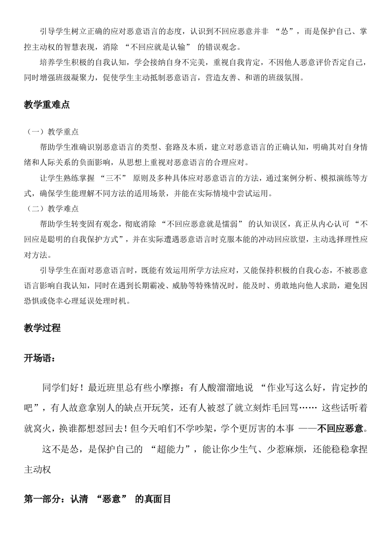 《不要回应“恶意”》主题班会恶意语言是“情绪垃圾”,谁接谁倒霉,咱不接!教学背景在当前班级日常学习生活中,恶意语言引发的小摩擦频发,具体表现为部分学生使用酸溜溜的话语质疑他人作业真实性(如“作业写这么好,肯定抄的吧”)、拿同学缺点开玩笑、传播不实谣言,且不少学生在遭遇此类恶意语言时,会本能地冲动回应,如回骂、辩解甚至发生肢体冲突,不仅破坏班级和谐氛围,还影响同学间的人际关系。从学生心理发展特点来看,此阶段学生正处于青春期初期,自我意识较强但情绪调控能力不足,大脑中负责情绪反应的“杏仁核”易被激活,而负责理性思考的“前额叶”尚未发育成熟,面对恶意语言时难以冷静处理,容易陷入情绪漩涡。同时,部分学生对恶意语言的认知存在偏差,要么将他人的恶意评价当作事实,产生自我怀疑:要么认为不回应恶意就是“怂”,进而选择以攻击性方式应对,导致矛盾升级。此外,班级中尚未形成抵制恶意语言的良好氛围,部分学生缺乏应对恶意语言的有效方法,亟需通过主题班会引导学生正确认知和处理恶意语言,提升情绪管理与人际交往能力,维护健康的班级环境。教学目标(一)认知目标帮助学生清晰认识恶意语言的本质,明确其并非正常交流话语,而是带有攻击性的“情绪武器”,了解酸溜溜型、故意挑事型、贬低打压型、阴阳怪气型等常见恶意语言类型及戳痛处、贴标签、激将法等套路。让学生明白遭遇恶意语言时,问题多源于对方(如心理不平衡、情绪宣泄、刷存在感等),而非自身过错,避免将恶意评价等同于自身事实,纠正认知偏差。(二)能力目标使学生掌握“三不”原则(不理睬、不争论、不报复)及物理隔绝+深呼吸、平淡“哦”+转移话题、万能“谢谢”法等不同层级的应对恶意语言的方法,能在实际遭遇恶意语言时灵活运用,减少冲动回应。提升学生的情绪调控能力,学会在面对恶意语言时通过深呼吸、合理发泄等方式平复情绪,避免被情绪左右,同时增强辨别特殊情况(如长期霸凌、威肋)的能力,掌握向老师、家长求助的正确方式。(三)情感与态度目标