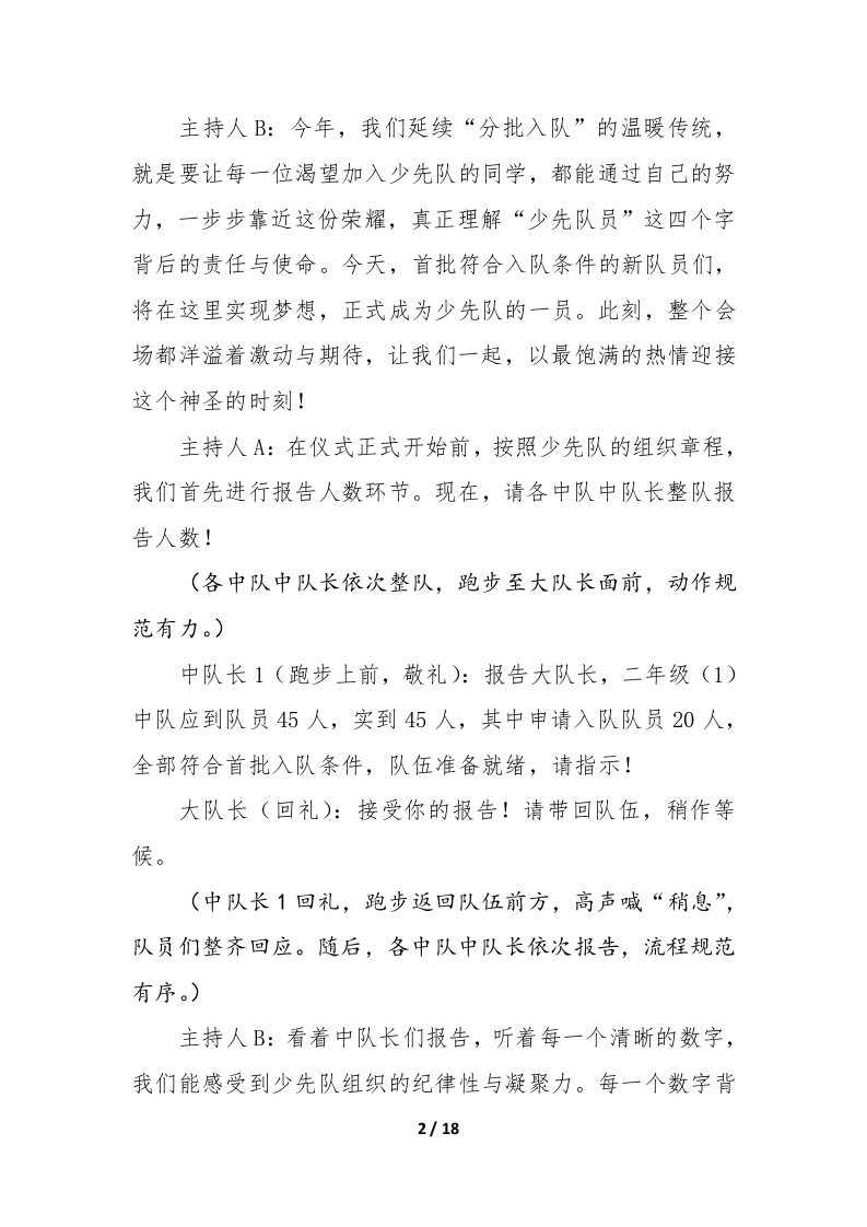 2025年第76个少先队建队日入队仪式主持词:星星火炬照新程逐梦少年续华章晨晨老师2个月前发布关注私信28.24KB18页0448 以下为资料部分截图预览,下载后为超高清原文件。 第1页 / 共18页 第2页 / 共18页 试读已结束,还剩16页,您可下载完整版后进行离线阅读 加入VIP,享海量教务资料,无限制免费下载所有材料 2025年第76个少先队建队日入队仪式主持词:星星火炬照新程逐梦少年续华章此内容为付费资源,请付费后查看¥9.99¥15.99VIP会员免费代理(享70%分佣)免费立即购买您当前未登录!建议登陆后购买,可保存购买订单付费资源© 版权声明文章版权归作者所有,未经允许请勿转载。THE END活动方案 文本预览 星星火炬跑新程逐梦少年续华章2025年第76个少先队建队日分批入队仪式主持词序章:薪火相传,少年逐梦预备阶段:整装待发,迎荣耀时刻(全场肃静,队员身着整齐校服,老队员胸前佩戴红领巾,新队员眼中满是期待。大队长站在主席台右侧;各中队中队长站在队伍前方。)主持人A(李沐阳):尊敬的各位领导、各位来宾,亲爱的辅导员老师们:主持人B(陈雨桐):可爱的老队员们,还有即将戴上红领巾、加入少先队大家庭的新队员们,家长朋友们,大家上午好!主持人A:时光的指针轻轻转动,从1949年少先队诞生的那一刻起,到2025年的今天,我们的少先队已经走过了76个春秋。星星火炬闪耀,76载风雨兼程,照亮了一代又一代少年的成长之路;76载薪火相传,少先队的旗帜始终在时代浪潮中飘扬,见证了无数少年从懵懂孩童成长为有理想、有担当的时代新人。1/18 查看更多 收起部分 喜欢就支持一下吧点赞8 分享QQ空间微博QQ好友海报分享复制链接收藏