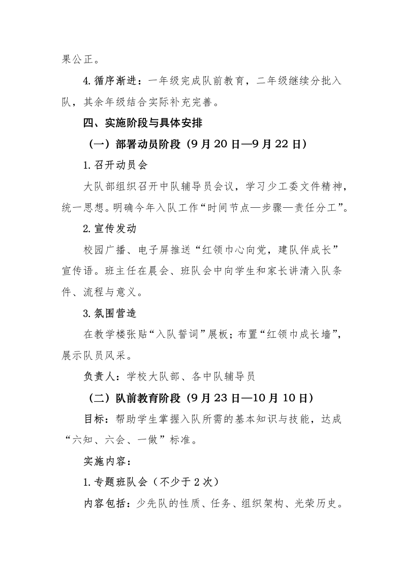 2025年少先队建队日分批入队活动方案:星火承志,我们光荣启程晨晨老师2个月前发布关注私信20.64KB9页0315 以下为资料部分截图预览,下载后为超高清原文件。 第1页 / 共9页 第2页 / 共9页 试读已结束,还剩7页,您可下载完整版后进行离线阅读 加入VIP,享海量教务资料,无限制免费下载所有材料 2025年少先队建队日分批入队活动方案:星火承志,我们光荣启程此内容为付费资源,请付费后查看¥9.99¥15.99VIP会员免费代理(享70%分佣)免费立即购买您当前未登录!建议登陆后购买,可保存购买订单付费资源© 版权声明文章版权归作者所有,未经允许请勿转载。THE END活动方案 文本预览 2025年少先队建队日分批入队活动方案星火承志·我们光荣启程一、指导思想为庆祝中国少年先锋队建队76周年,全面贯彻落实《关于构建阶梯式成长激励体系增强少先队员光荣感的指导意见》,结合学校工作实际,制定本学期分批入队活动方案。通过分批入队、阶梯成长、仪式教育、实践体验,进一步规范入队程序,增强少先队员的光荣感和使命感,推动我校少先队工作高质量发展,落实立德树人根本任务。二、工作目标通过队前教育和仪式教育,让适龄儿童在思想上完成一次成长洗礼;坚持“分批入队”,以“达标一批、吸收一批”为原则,激励学生向少先队标准看齐;严格按照入队标准、程序、礼仪执行,确保活动庄重、规范、有序;通过知识竞赛、志愿行动、成长记录等,促进学生知行合一;通过家校协同与社会支持,增强分批入队的社会影响力。三、工作原则1.全童入队:以“达标一批、吸收一批”为原则,逐步实现适龄学生全员入队。2.规范程序:严格执行“队前教育一考核评价一登记注册一庄严入队”四个环节。3.公平公正:公开评价标准与结果,确保过程透明、结 查看更多 收起部分 喜欢就支持一下吧点赞5 分享QQ空间微博QQ好友海报分享复制链接收藏