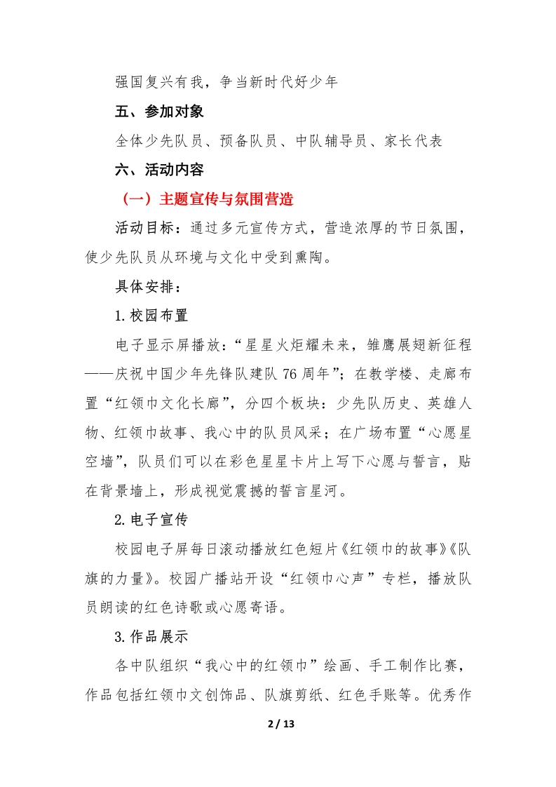 2025年学校建队日活动实施方案:强国复兴有我,争当新时代好少年晨晨老师2个月前发布关注私信29.02KB13页0225 以下为资料部分截图预览,下载后为超高清原文件。 第1页 / 共13页 第2页 / 共13页 试读已结束,还剩11页,您可下载完整版后进行离线阅读 加入VIP,享海量教务资料,无限制免费下载所有材料 2025年学校建队日活动实施方案:强国复兴有我,争当新时代好少年此内容为付费资源,请付费后查看¥9.99¥15.99VIP会员免费代理(享70%分佣)免费立即购买您当前未登录!建议登陆后购买,可保存购买订单付费资源© 版权声明文章版权归作者所有,未经允许请勿转载。THE END活动方案 文本预览 2025年学校建队日活动实施方案一强国复兴有我,争当新时代好少年一、指导思想2025年是中国少年先锋队建队76周年,全面落实立德树人根本任务,深入落实《关于全面加强新时代少先队工作的意见》。通过庄重的仪式教育、系统的队前培训、沉浸式的闯关挑战、创新的主题队会和多维度的系列实践活动,让少先队员在“学中做、做中悟、悟中行”中接受精神洗礼,提升归属感,树立远大理想,努力成长为新时代好少年。二、工作目标1.强化仪式教育:通过入队仪式、宣誓与呼号,培育庄重感与使命感。2.突出实践育人:设计环环相扣的系列活动,让队员在劳动、志愿、展示、体验中收获成长。3.拓展育人空间:联动家庭、社区、社会资源,实现“学校一家庭一社会”三位一体协同育人。4.营造良好氛围:线上线下宣传互动,形成全校、全社会共同关注少先队成长的浓厚氛围。三、活动时间2025年9月25日一10月26日四、活动主题1/13 查看更多 收起部分 喜欢就支持一下吧点赞5 分享QQ空间微博QQ好友海报分享复制链接收藏