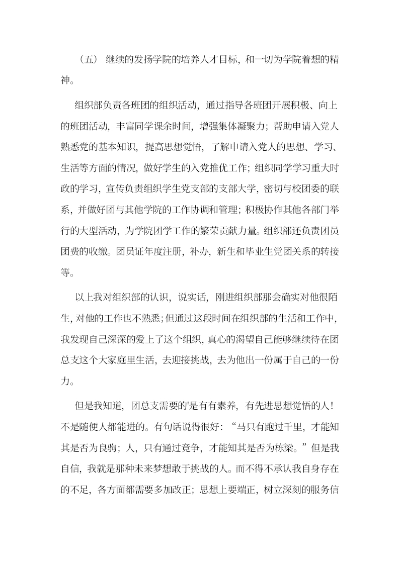 团总支组织部常务副部申请书尊敬的领导:你好刊我叫杨XX,是经济管理学院团总支组织的一员。这次提成申请成为组织部的常务副部,希望自己能为团总支组织部出一份自己的力。首先,我感到十分荣幸能够参加这次的竞选。虽然我进入团总支的时间不长,但从进入以来各种活动使我总结了一些工作经验,加深了对团总支组织部的结构和运作有了充分的理解,也是我的能力得到了提升,这里的工作经验更生对我来说非常的珍贵。而在同学们的帮助下和自己的努力下,我也收获了很多。正所谓不想当将军的兵不是好士兵,在我看来,虽然上次申请副部失败,但对于任何机会,我都要争取。或许我还存在着许多的不足,但我至少还有争取的勇气。我竞选的理由有一下几条:(一)本着锻炼和培养自身优秀的素质,完善自我!(二)再接再厉,为团总支和同学贡献自己的微薄之力。(三)有工作的热情,我认为热情是工作的源动力。(四)我是个守时的人,现在很多人都不守时,希望因为我守时而带动不守时的人。