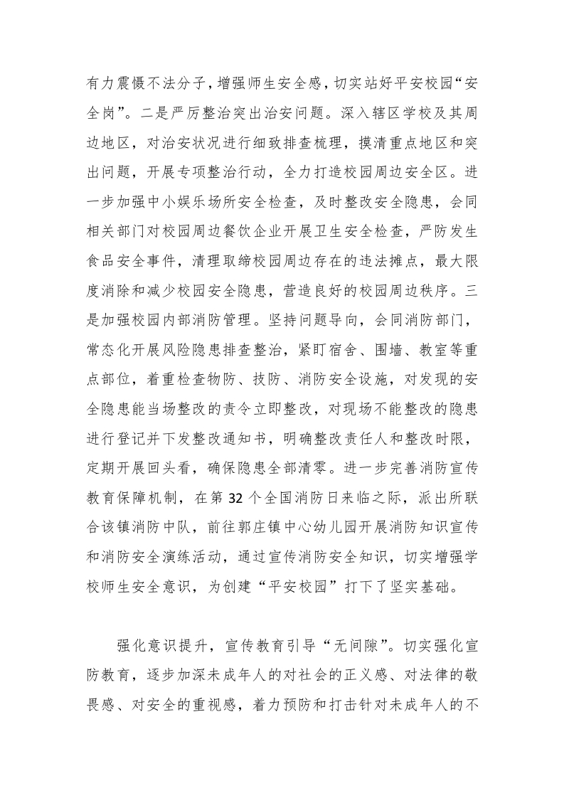 未成年人保护站经验材料:擦亮关爱工作站品牌护航未成年人健康成长晨晨老师2个月前发布关注私信14.78KB5页03612 以下为资料部分截图预览,下载后为超高清原文件。 第1页 / 共5页 第2页 / 共5页 试读已结束,还剩3页,您可下载完整版后进行离线阅读 加入VIP,享海量教务资料,无限制免费下载所有材料 未成年人保护站经验材料:擦亮关爱工作站品牌护航未成年人健康成长此内容为付费资源,请付费后查看¥9.99¥15.99VIP会员免费代理(享70%分佣)免费立即购买您当前未登录!建议登陆后购买,可保存购买订单付费资源© 版权声明文章版权归作者所有,未经允许请勿转载。THE END活动方案 文本预览 未成年人保护站经验材料:擦亮关爱工作站品牌护航未成年人健康成长为深入贯彻落实系列未成年人保护法律、法规,进一步发挥公安机关在未成年人保护工作中的重要作用,今年以来,XXX市公安局郭庄派出所全力以赴防风险、保安全、护稳定,将派出所关爱工作站建设作为护航未成年成长工作的基本着力点,有效推动关心下一代工作的延伸拓展和公安基础工作相融合,为辖区未成年人成长保驾护航。全面清查整治,安全隐患排查“无漏洞”。为切实提升辖区校园安全防范水平,为师生营造良好的校园学习环境和安全环境,郭庄派出所紧紧围绕构建“平安、和谐”校园的宗旨,依托校园警务室建设,提前谋划,精心部署、多措并举,全力保障良好的校园安全秩序。一是强化校园周边巡逻防控。根据辖区小学、幼儿园上下学时间,采取定人、定岗、定责的方式设立“护学岗”,定点学校为辖区葛村中心幼儿园、葛村中心小学及碧桂园小金星幼儿园。同时组织巡逻警力加大各学校、幼儿园附近上下学高峰时段巡逻防控,关注可疑人员可疑车辆,确保遇突发事件快速反映、快速处置, 查看更多 收起部分 喜欢就支持一下吧点赞12 分享QQ空间微博QQ好友海报分享复制链接收藏