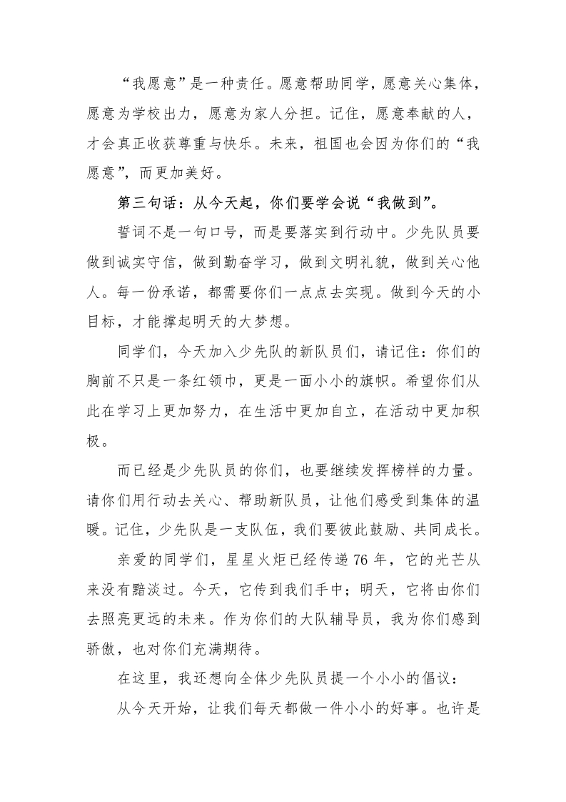 学校大队辅导员在第76个建队日暨新队员入队仪式上的讲话稿:红领巾的誓言星星火炬的接力晨晨老师2个月前发布关注私信12.62KB3页0516 以下为资料部分截图预览,下载后为超高清原文件。 第1页 / 共3页 第2页 / 共3页 试读已结束,还剩1页,您可下载完整版后进行离线阅读 加入VIP,享海量教务资料,无限制免费下载所有材料 学校大队辅导员在第76个建队日暨新队员入队仪式上的讲话稿:红领巾的誓言星星火炬的接力此内容为付费资源,请付费后查看¥9.99¥15.99VIP会员免费代理(享70%分佣)免费立即购买您当前未登录!建议登陆后购买,可保存购买订单付费资源© 版权声明文章版权归作者所有,未经允许请勿转载。THE END活动方案 文本预览 红领巾的誓言星星火炬的接力学校大队辅导员在第76个建队日暨新队员入队仪式上的讲话亲爱的少先队员们,尊敬的老师们:大家好!今天,我们迎来了中国少年先锋队建队第76周年的光辉日子。此时此刻,当鲜艳的队旗在操场上迎风飘扬,当嘹亮的队歌在耳边响起,我们的心中都涌动着一份庄严与自豪。尤其是刚刚加入少先队的新队员们,你们的脸上洋溢着光荣的神情,这一刻将成为你们童年最难忘的记忆之同学们,红领巾不仅仅是一块鲜艳的布料,它是国旗的一角,是无数革命先烈用生命和鲜血染红的。今天,你们佩戴上了红领巾,就意味着你们成为了中国少年先锋队的一员。从这一刻起,你们肩上多了一份责任,胸中燃起了一份使命。作为你们的大队辅导员,我特别想和大家说三句话。第一句话:从今天起,你们要学会说“我能行”。新队员们,你们也许年纪还小,但“我能行”是一种态度。打扫教室的时候,请告诉自己:我能行;遇到难题的时候,请提醒自己:我能行;参加集体活动的时候,请勇敢地说:我能行。因为相信自己,你们就会一步步变得坚强、勇敢。第二句话:从今天起,你们要学会说“我愿意”。 查看更多 收起部分 喜欢就支持一下吧点赞6 分享QQ空间微博QQ好友海报分享复制链接收藏