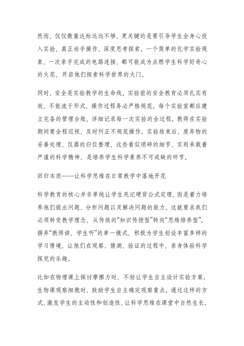 全校科学教育推进会校长讲话稿:用好奇心敲开科学的大门晨晨老师1个月前发布关注私信15.67KB6页0388 以下为资料部分截图预览,下载后为超高清原文件。 第1页 / 共6页 第2页 / 共6页 试读已结束,还剩4页,您可下载完整版后进行离线阅读 加入VIP,享海量教务资料,无限制免费下载所有材料 全校科学教育推进会校长讲话稿:用好奇心敲开科学的大门此内容为付费资源,请付费后查看¥9.99¥15.99VIP会员免费代理(享70%分佣)免费立即购买您当前未登录!建议登陆后购买,可保存购买订单付费资源© 版权声明文章版权归作者所有,未经允许请勿转载。THE END校长讲话 文本预览 各位老师、同仁们:今天这场会议意义重大且十分及时,刚刚几位分管领导与教研组长的发言,干货满满,分享了许多切实可行的方法与独到深刻的思路,让人深受启发。从大家的交流中,我真切感受到学校在科学教育领域正发生着积极而深刻的变化,更看到了各位老师对科学教育改革所饱含的热情与冲劲,这是我们推进科学教育工作最宝贵的力量。在当下,国家对科学教育重视程度之高,达到了前所未有的高度。今年以来,全面提升中小学科学教育质量被摆在了突出位置,这绝非简单的口号,而是关乎国家创新人才培养、关乎民族未来发展的核心大事。在此宏观背景下,我们召开此次推进会,目的就是要进一步凝聚共识、校准方向,将科学教育工作落地、落实、落细。接下来,围绕“守正创新,推动科学教育迈向高质量发展”这一主题,我从四个方面谈谈想法与期望。筑牢根基一让实验成为科学探索的源头活水实验是科学教育的基石,课堂则是实验教学的主阵地。实验室不应沦为闲置的空间,实验更不能仅是书本上的理论演绎。对于物理、化学、生物、地理等学科的基础实验,我们务必保证百分百的开出率,这是不可动摇的底线。 查看更多 收起部分 喜欢就支持一下吧点赞8 分享QQ空间微博QQ好友海报分享复制链接收藏