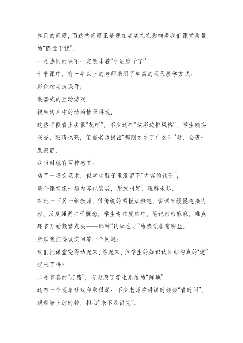 听课十节后校长讲话:我们的课堂,是在教学生,还是在演给领导看?晨晨老师1个月前发布关注私信16.89KB7页05012 以下为资料部分截图预览,下载后为超高清原文件。 第1页 / 共7页 第2页 / 共7页 试读已结束,还剩5页,您可下载完整版后进行离线阅读 加入VIP,享海量教务资料,无限制免费下载所有材料 听课十节后校长讲话:我们的课堂,是在教学生,还是在演给领导看?此内容为付费资源,请付费后查看¥9.99¥15.99VIP会员免费代理(享70%分佣)免费立即购买您当前未登录!建议登陆后购买,可保存购买订单付费资源© 版权声明文章版权归作者所有,未经允许请勿转载。THE END校长讲话 文本预览 各位老师,同仁们:大家下午好!这几天我们围绕“优质课评比”组织了一系列听评课活动。我也坐在教室里,一上午一上午地听、一节一节地看,涵盖了不同学段、不同学科、不同风格的老师,可以说是既开了眼界,也生出了很多思考。今天,我原本也可以照例,把课听完、分数给完、记录收集完就结束。但我心里始终觉得,如果说这些听课活动的真正价值,只是评出谁讲得更精彩、谁设计更完善,那它也就只能成为一次“竞技表演”了。教育不是一场临时赛,它是一种携带责任的集体工作。一节节课背后,是我们面对孩子的“教学信号”。于是今天,我想利用这个机会,不是来讲一句“这次优质课活动圆满成功”,也不是来点评哪一节更亮眼,而是想跟大家谈一谈这些课带给我的提醒、反思和再认识。希望借此我们能一起回答一个问题:我们的课堂,究竟在教给学生什么?第一部分:从一个学生的视角,再看我们熟悉的课堂我想先和大家分享一点我听课时的小小尝试一一当我坐在教室的后排,我有意地让自己“放下校长的身份”,试着化身一个普通学生:看老师的板书、听语速、感受自己的专注度和兴趣点。这样一来,我发现了很多平时“作为管理者”不太容易第一时间感 查看更多 收起部分 喜欢就支持一下吧点赞12 分享QQ空间微博QQ好友海报分享复制链接收藏