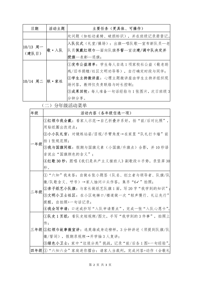第76个少先队建队日活动方案晨晨老师1个月前发布关注私信0.28MB3页0447 以下为资料部分截图预览,下载后为超高清原文件。 第1页 / 共3页 第2页 / 共3页 试读已结束,还剩1页,您可下载完整版后进行离线阅读 加入VIP,享海量教务资料,无限制免费下载所有材料 第76个少先队建队日活动方案此内容为付费资源,请付费后查看¥9.99¥15.99VIP会员免费代理(享70%分佣)免费立即购买您当前未登录!建议登陆后购买,可保存购买订单付费资源© 版权声明文章版权归作者所有,未经允许请勿转载。THE END活动方案 文本预览 第76个少先队建队日活动方案强国复兴有我,争当新时代好少年一、活动背景与意义1949年10月13日,全国统一的少年儿童组织宣布成立,1953年定名为中国少年先锋队,10月13日成为全体少先队员的共同纪念日。少先队是学校思想政治教育与校园文化建设的重要阵地,承载着“从小学先锋、长大做先锋”的价值引领。,建队日不只是“看得见的仪式”,更是贯通“学一训一做”的综合育人课程。通过队史学习与队章熟悉(学)、礼仪规程与岗位训练(训)、志愿服务与家国情怀培育(做),让预备队员达标入队、老队员在服务中成长,真正把“六知、六会、一做”的队前教育落到每一个孩子身上。二、活动主题红领照耀未来路·少年逐梦担使命三、活动时间2025年10月9日(周四)一10月15日(周三)四、参与对象全校少先队员与预备队员;中队辅导员、班主任;家长志愿者与校外支持单位(按需邀请)五、活动内容(一)全校性活动日期活动主题主要任务(更具体、可操作)①预演入队仪式:由中队长发口令,班级在10分钟内按“整队一报数一出旗一唱队歌一呼号一敬礼一退旗”全流程演10/10周五规·礼仪练一次:②规范对照纠偏:礼仪监督员按清单检查站姿、手臂角度口令音量与节奏,现场纠正一次并复走;①校内三件事:每班自组服务小队完成A文明引导(课间门厅/楼梯口礼让提醒)B.图书角整理(按类上架并贴“类10/11周六践·志愿目签”)C.绿地微养护(浇灌/捡拾/修剪筒单枯枝);②设施小巡检:按“发现一上报一复检”闭环至少完成1第1页共3页 查看更多 收起部分 喜欢就支持一下吧点赞7 分享QQ空间微博QQ好友海报分享复制链接收藏