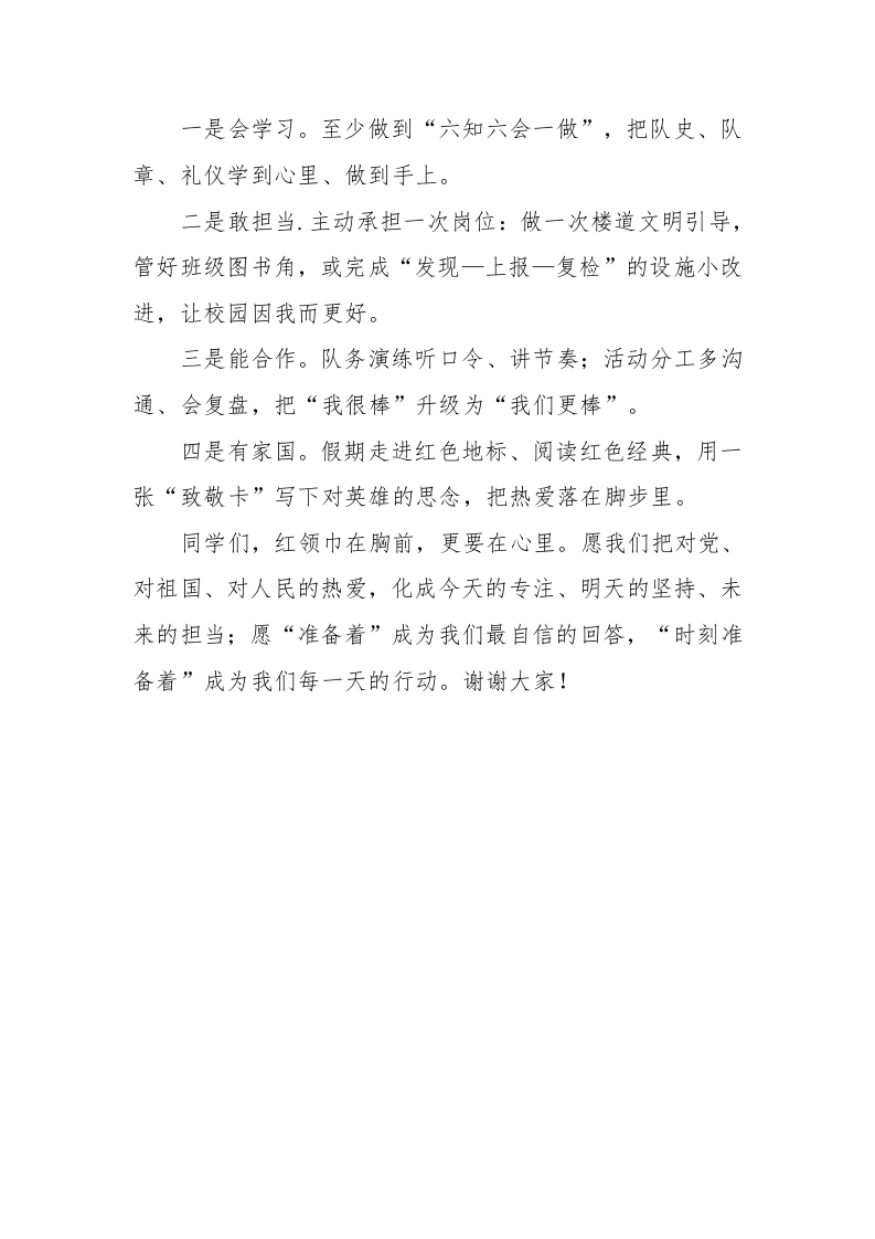 第76个少先队建队日学生讲话稿一强国复兴有我,争当新时代好少年老师们、同学们,大家好!今天,我们在队旗下迎来第76个中国少年先锋队建队日。1949年10月13日,全国统一的少年儿童组织一一“中国少年儿童队”成立;1953年更名为“中国少年先锋队”,这一天也成为我们共同的节日。请抬头看队旗:五角星象征党的领导,火炬象征光明与真理;旗面通红,来自红旗的一角,提醒我们继承前辈的荣光与担当。少先队由共青团受党委托直接领导,是我们学习中国特色社会主义、践行社会主义核心价值观的学校,是建设社会主义和共产主义的预备队。为什么建队日重要?因为它让我们再次回答三件事:我是谁一一是胸佩红领巾的少先队员:为谁而学一一为人民、为祖国;要成为什么样的人一一德智体美劳全面发展的新时代好少年。今天的每个规范动作,都是把理想变成行动的开始。宣誓时,右拳与耳齐、拳心向前;仪式环节依次为出旗一唱队歌一呼号一誓词一退旗,标准不走样、秩序不打折。此刻,让我们在心里重温:“准备着:为共产主义事业而奋斗!”“时刻准备着!”这不是口号,而是今天与每天的作业。我向全体同学发出四点倡议: