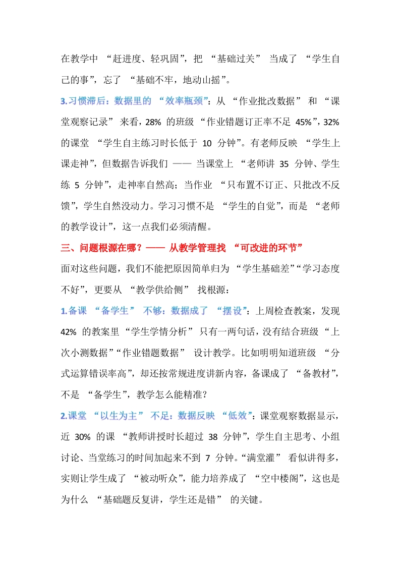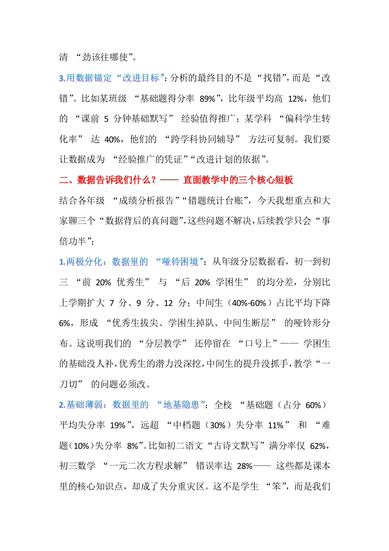 月考成绩分析会,校长讲话:锚定数据找问题,回归本真抓教学晨晨老师1个月前发布关注私信14.64KB5页0468 以下为资料部分截图预览,下载后为超高清原文件。 第1页 / 共5页 第2页 / 共5页 第3页 / 共5页 试读已结束,还剩2页,您可下载完整版后进行离线阅读 加入VIP,享海量教务资料,无限制免费下载所有材料 月考成绩分析会,校长讲话:锚定数据找问题,回归本真抓教学此内容为付费资源,请付费后查看¥9.99¥15.99VIP会员免费代理(享70%分佣)免费立即购买您当前未登录!建议登陆后购买,可保存购买订单付费资源© 版权声明文章版权归作者所有,未经允许请勿转载。THE END校长讲话 文本预览 月考成绩分析会,校长讲话:锚定数据找问题,回归本真抓教学各位老师:大家好!新学期第四周已过,今天我们召开月考成绩分析会,不是一次常规的“分数通报会”,而是一场“教学诊疗会”。就像农人种田要蹲在田埂看苗情,我们也要对着数据找问题一一从每一个分数背后,看清教学的得与失,让浮躁的教学节奏慢下来、实起来,回归“抓基础、重实效、育真人”的本真。一、为什么要“用数据说话”?一明确会议的核心价值在座的每位老师都深耕教学一线,我们都清楚:“感觉有问题”不如“数据证明有问题”,“笼统提要求”不如“数据指引怎么改”。今天我们聚在这里,核心是解决三个“真问题”:1.用数据拆穿“模糊认知”:比如大家常说“学生基础不牢”,但数据能告诉我们一一是初一数学“有理数运算”失分率达22%,还是初三物理“电路分析”基础题错了35%?只有把问题从“印象”变成“具体数据”,才能精准发力。2.用数据凝聚“集体共识”:上周教务处汇总了全校数据,发现三个共性问题:各年级“优秀生与学困生均分差”最大达18分,“偏科学生占比”最高年级达32%,“基础题失分率”平均19%。这些不是个别班级的问题,是我们全体要共同攻克的难关,数据让我们看 查看更多 收起部分 喜欢就支持一下吧点赞8 分享QQ空间微博QQ好友海报分享复制链接收藏