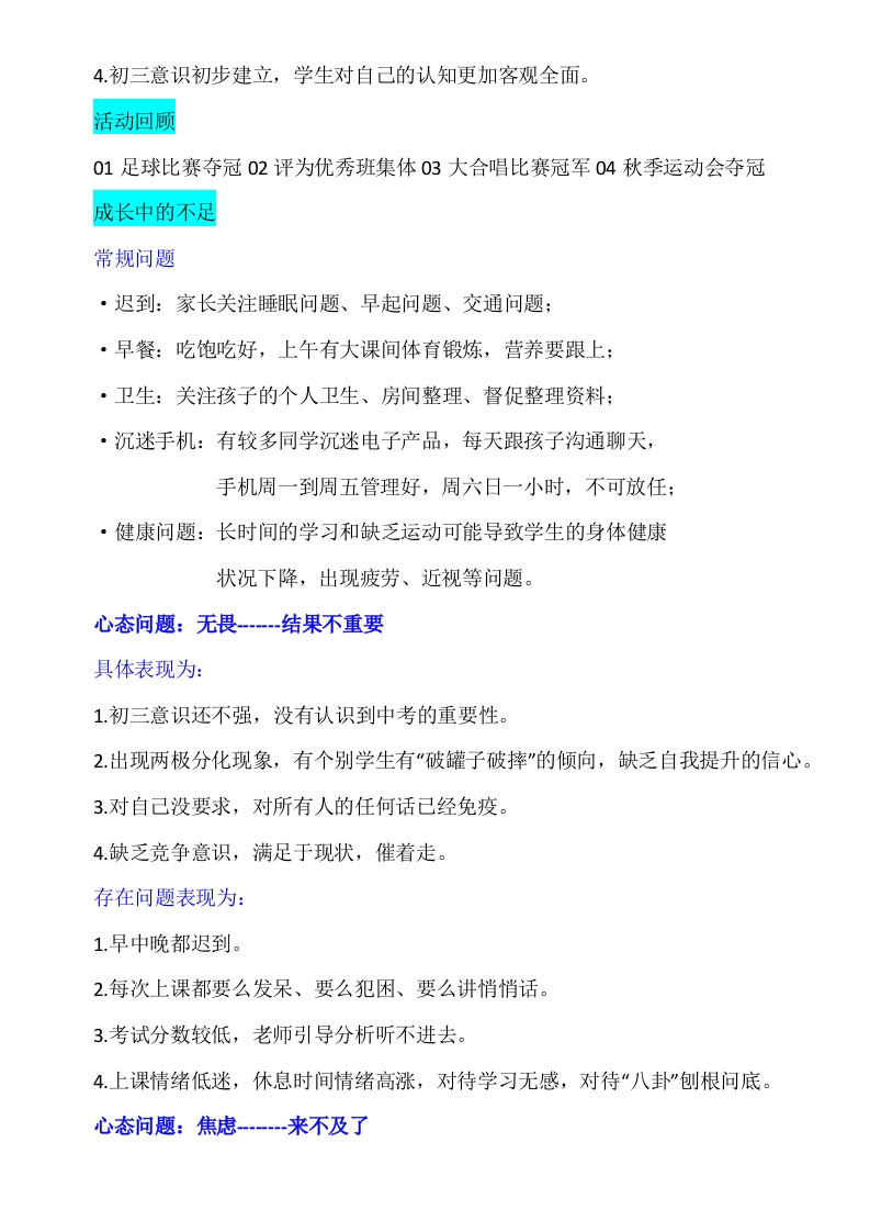 【初三】【秋季上】期中家长会:初三已至,同心共赴晨晨老师1个月前发布关注私信38.19KB18页0406 以下为资料部分截图预览,下载后为超高清原文件。 第1页 / 共18页 第2页 / 共18页 试读已结束,还剩16页,您可下载完整版后进行离线阅读 加入VIP,享海量教务资料,无限制免费下载所有材料 【初三】【秋季上】期中家长会:初三已至,同心共赴此内容为付费资源,请付费后查看¥9.99¥15.99VIP会员免费代理(享70%分佣)免费立即购买您当前未登录!建议登陆后购买,可保存购买订单付费资源© 版权声明文章版权归作者所有,未经允许请勿转载。THE END班级管理 文本预览 【初三】【上期中】【初三已至同心共赴】家长会-发言稿尊敬的各位家长以及正蓬勃成长的初三学子们:大家下午好!在这个金秋送爽、硕果累累的美好季节里,我们带着对未来的无限憧憬与希望,齐聚一堂,共同迎来了本学期期中阶段的家长会。首先,请允许我向在百忙之中抽空出席今天会议的每一位家长表示最热烈的欢迎和最诚挚的感谢!您的到来,不仅是对孩子成长的深切关怀,更是对我们教育工作最有力的支持与肯定。初三,这个被赋予“转折”与“挑战”的年份,对于每一位在座的学子而言,都是人生旅途中一个至关重要的站台。它不仅是知识积累与能力提升的关键时期,更是梦想启航、志向坚定的起点。在过去的几个月里,我们的孩子们以青春的名义,在学习的道路上勇往直前,用汗水浇灌希望,以勤奋铸就梦想。而这一切努力与成长的背后,离不开每一位家长的默默付出与悉心陪伴,也离不开老师们的辛勤耕耘与无私奉献。今天的家长会分有4个部分进行:剖析现状,聚焦中考;优化心态,助力中考;智慧相伴,助力成长;初三已至,同心共赴。一、剖析现状,聚焦中考班级情况分析两年以来孩子们的成长1.班级逐渐形成了良好的学风,班级内有一批学习踏实,有自主性,有带动性的学生引领班级风气。2.在运动会,足球赛等活动中,班级凝聚力得到凝聚,班级学生相处融洽,互帮互助。3.期中考试前阶段,学劲十足,任课老师每日进班辅导,学生问题活跃,上课和自习状态反馈优秀。 查看更多 收起部分 喜欢就支持一下吧点赞6 分享QQ空间微博QQ好友海报分享复制链接收藏