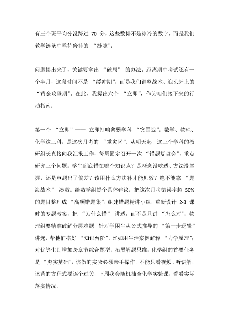 校长在教学质量推进会上划重点:6个“立即行动”jia3点硬要求,期中逆袭就靠这波操作!晨晨老师1个月前发布关注私信17.27KB16.85KB8页05112 以下为资料部分截图预览,下载后为超高清原文件。 第1页 / 共8页 第2页 / 共8页 试读已结束,还剩6页,您可下载完整版后进行离线阅读 加入VIP,享海量教务资料,无限制免费下载所有材料 校长在教学质量推进会上划重点:6个“立即行动”jia3点硬要求,期中逆袭就靠这波操作!此内容为付费资源,请付费后查看¥9.99¥15.99VIP会员免费代理(享70%分佣)免费立即购买您当前未登录!建议登陆后购买,可保存购买订单付费资源© 版权声明文章版权归作者所有,未经允许请勿转载。THE END发言讲话家长会 文本预览 校长在教学质量推进会上划重点:6个“立即行动”+3点硬要求,期中逆袭就靠这波操作!各位领导、各位老师:刚刚落幕的月考,是新学期首场全规模教学质量“体检”。如今成绩单已分发至各年级组,那些跳动的数字背后,藏着我们教学的真实模样一一几家欢喜几家愁。今天咱们开这个会,既不是为成绩优异者庆功,也不是为暂时落后者追责,而是一次“把准脉、开对药”的教学质量推进会。唯有直面问题,才能找准突破方向。这两天我逐份翻阅了各年级的试卷分析报告,几个现象让我深感警醒:高三距离高考仅剩七个多月,数学平均分却只有72分,比去年同期整整低了8分,这8分背后,是我们冲刺阶段的“底气”不足:高二物理成绩两极分化到了刺眼的程度一一最高分98分近乎满分,最低分却只有12分,这绝不是学生智力的差距,而是我们分层教学“隔靴搔痒”,没真正帮到需要的孩子;高一的基础漏洞更明显,语文默写题平均得分率刚过60%,英语单词拼写错误率飙到40%,这说明我们课堂上的基础训练,既缺“强度”更缺“精度”;初中部同样不容懈怠,初三化学全年级及格率刚踩线60%,初二数学还 查看更多 收起部分 喜欢就支持一下吧点赞12 分享QQ空间微博QQ好友海报分享复制链接收藏