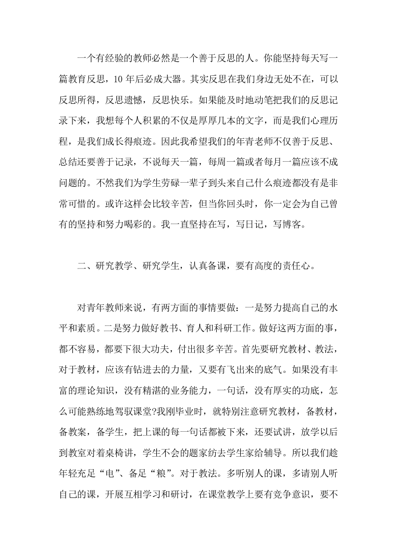 青年教师座谈会上,校长讲话希望大家拿出十二分的热情投入学习与工作,克服困难,迎接挑战,不断磨练,早日成为学校的栋梁晨晨老师1个月前发布关注私信15.50KB4页03912 以下为资料部分截图预览,下载后为超高清原文件。 第1页 / 共4页 第2页 / 共4页 试读已结束,还剩2页,您可下载完整版后进行离线阅读 加入VIP,享海量教务资料,无限制免费下载所有材料 青年教师座谈会上,校长讲话希望大家拿出十二分的热情投入学习与工作,克服困难,迎接挑战,不断磨练,早日成为学校的栋梁此内容为付费资源,请付费后查看¥9.99¥15.99VIP会员免费代理(享70%分佣)免费立即购买您当前未登录!建议登陆后购买,可保存购买订单付费资源© 版权声明文章版权归作者所有,未经允许请勿转载。THE END校长讲话 文本预览 老师们:在座的年轻人应该都是我们学校的末来,是学校的后备军,我们xx中学的发展离不开你们。今天在此我们一起分析交流,目的就是希望你们能认识自我,把这个集体作为你施展能力的舞台,能为学校贡献心力,把你的潜能都发挥出来,实现个人与学生、与学校的共同进步与发展,下面我从三个方面与大家进行交流:一、青年教师要善于学习、善于反思。有人说,年轻就是资本;我认为这话说的太好了,作为教师“要想给人一勺水,自己得有一桶水”,这话既道出了资本的重要,又提醒教师得不断学习,时时充电。作为年轻教师我们学习的途径是很多的。可以向书本学习,也可以利用网络媒体学习,不只学习自己的专业知识,还应该学习与之相关的知识。现在网络这么便捷,它为我们的学习提供方便。每天就抽半个小时用于学习,过不了多久,你就会发现自己的变化。会学习的人永远走在路的前面,提高自身的涵养才能保证桶中的水永不枯竭。还应该向我们身边的老师学习,甚至向学生学习,说实在的,学习理论知识必须趁年轻,真是到了你年岁大点了有时候想学都记不住了。 查看更多 收起部分 喜欢就支持一下吧点赞12 分享QQ空间微博QQ好友海报分享复制链接收藏
