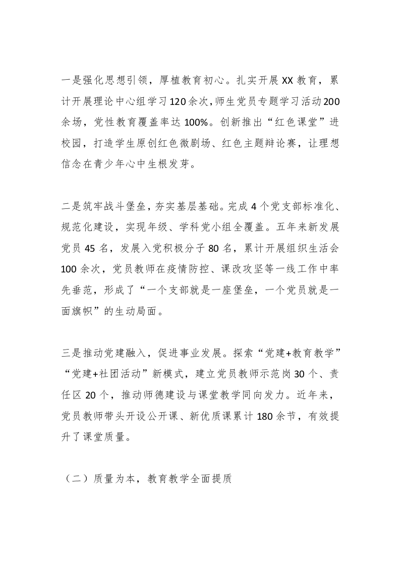 学校“十四五”期间工作完成情况和“十五五”期间工作安排晨晨老师1个月前发布关注私信20.11KB14页02113 以下为资料部分截图预览,下载后为超高清原文件。 第1页 / 共14页 第2页 / 共14页 试读已结束,还剩12页,您可下载完整版后进行离线阅读 加入VIP,享海量教务资料,无限制免费下载所有材料 学校“十四五”期间工作完成情况和“十五五”期间工作安排此内容为付费资源,请付费后查看¥9.99¥15.99VIP会员免费代理(享70%分佣)免费立即购买您当前未登录!建议登陆后购买,可保存购买订单付费资源© 版权声明文章版权归作者所有,未经允许请勿转载。THE END综合资料 文本预览 学校“十四五”期间工作完成情况和“十五五”期间工作安排“十四五”时期,是我国教育改革持续深化、教育强国战略纵深推进的关键五年。我们学校在市委市政府和上级教育主管部门的坚强领导下,坚持以习近平新时代中国特色社会主义思想为指导,全面贯彻党的教育方针,落实立德树人根本任务,把提质增效作为主线,把改革创新作为动力,把师生成长作为根本,努力办好人民满意的教育。回望这五年,我们在党建统领、质量提升、队伍建设、校园文化、服务民生等方面砥砺奋进,留下了坚实印记;展望“十五五”,我们将在新的起点上,接续奋斗、再攀高峰。现将“十四五”时期工作总结及“十五五”规划思路汇报如下:一、“十四五”期间工作完成情况(一)党建引领,办学方向更加坚定党建是学校发展的根与魂。五年来,我们坚持党对教育工作的全面领导,把党的政治优势转化为办学优势,让校园始终沿着正确方向笃定前行。 查看更多 收起部分 喜欢就支持一下吧点赞13 分享QQ空间微博QQ好友海报分享复制链接收藏