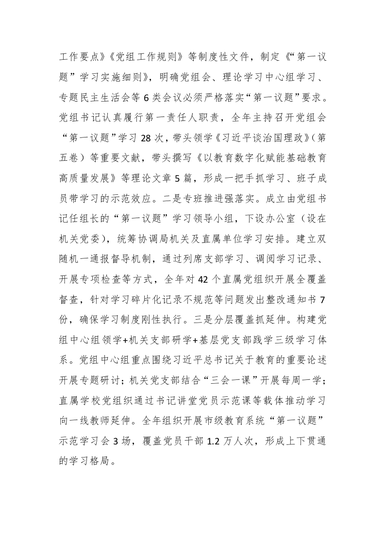 市教育局党组关于落实“第一议题”学习制度工作情况的报告晨晨老师1个月前发布关注私信16.48KB8页04912 以下为资料部分截图预览,下载后为超高清原文件。 第1页 / 共8页 第2页 / 共8页 试读已结束,还剩6页,您可下载完整版后进行离线阅读 加入VIP,享海量教务资料,无限制免费下载所有材料 市教育局党组关于落实“第一议题”学习制度工作情况的报告此内容为付费资源,请付费后查看¥9.99¥15.99VIP会员免费代理(享70%分佣)免费立即购买您当前未登录!建议登陆后购买,可保存购买订单付费资源© 版权声明文章版权归作者所有,未经允许请勿转载。THE END党建资料 文本预览 市教育局党组关于落实“第一议题”学习制度工作情况的报告今年以来,市教育局党组坚持以习近平新时代中国特色社会主义思想为指导,深入贯彻落实“第一议题”学习制度及省委、市委有关工作要求,始终把政治建设摆在首位,将“第一议题”学习作为加强党的创新理论武装的根本保障,作为推进教育系统全面从严治党的重要抓手,结合教育高质量发展实际,构建学思用贯通、知信行统一的理论学习体系,切实把学习成果转化为破解教育难题、提升育人质量的强大动力,为打造区域教育高地提供坚强政治引领。现将工作开展情况报告如下。一、工作开展情况。(一)强化政治引领,构建三位一体组织领导体系。市教育局党组深刻认识到“第一议题”制度是强化政治机关意识、践行“两个维护”的重要制度安排,始终将其作为党组工作的头号工程,构建起党组负总责、支部抓落实、党员全覆盖的三级联动机制。一是高位推动抓统筹。局党组切实履行主体责任,将“第一议题”学习纳入《市教育局2025年党建 查看更多 收起部分 喜欢就支持一下吧点赞12 分享QQ空间微博QQ好友海报分享复制链接收藏