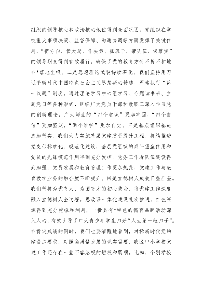 在2025年全区中小学校党建工作推进会议上的讲话晨晨老师1个月前发布关注私信17.51KB9页03412 以下为资料部分截图预览,下载后为超高清原文件。 第1页 / 共9页 第2页 / 共9页 试读已结束,还剩7页,您可下载完整版后进行离线阅读 加入VIP,享海量教务资料,无限制免费下载所有材料 在2025年全区中小学校党建工作推进会议上的讲话此内容为付费资源,请付费后查看¥9.99¥15.99VIP会员免费代理(享70%分佣)免费立即购买您当前未登录!建议登陆后购买,可保存购买订单付费资源© 版权声明文章版权归作者所有,未经允许请勿转载。THE END党建资料 文本预览 在2025年全区中小学校党建工作推进会议上的讲话同志们:今天,我们在这里召开全区中小学校党建工作推进会议,主要任务是深入学习贯彻习近平总书记关于党的建设的重要思想和关于教育的重要论述,全面落实全国、省、市相关会议精神,总结经验、分析形势,研究部署下一阶段我区中小学校党建工作的重点任务。刚才,几位同志作了很好的交流发言,分享了宝贵经验,听了很受启发。下面,我讲几点意见。一、肯定成绩,正视不足,切实增强抓好新时代中小学校党建工作的责任感和紧迫感近年来,区委教育工委坚决贯彻落实中央和省委、市委、区委关于加强中小学校党的建设的决策部署,全区教育系统各级党组织坚持以政治建设为统领,聚焦主责主业,狠抓工作落实,推动中小学校党建工作取得了显著成效。一是政治核心作用不断彰显。我们始终把党的政治建设摆在首位,严格落实党组织领导的校长负责制,全区中小学校党 查看更多 收起部分 喜欢就支持一下吧点赞12 分享QQ空间微博QQ好友海报分享复制链接收藏