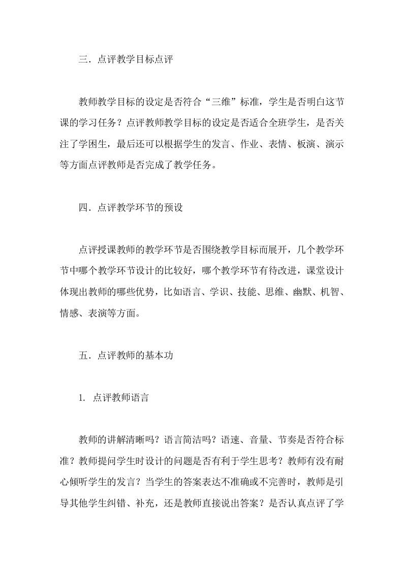 听课评课有细则,校长讲话,让你的点评赢得满堂喝彩晨晨老师1个月前发布关注私信15.50KB4页0267 以下为资料部分截图预览,下载后为超高清原文件。 第1页 / 共4页 第2页 / 共4页 试读已结束,还剩2页,您可下载完整版后进行离线阅读 加入VIP,享海量教务资料,无限制免费下载所有材料 听课评课有细则,校长讲话,让你的点评赢得满堂喝彩此内容为付费资源,请付费后查看¥9.99¥15.99VIP会员免费代理(享70%分佣)免费立即购买您当前未登录!建议登陆后购买,可保存购买订单付费资源© 版权声明文章版权归作者所有,未经允许请勿转载。THE END校长讲话 文本预览 各位老师:听课评课是我们成长必走的途径,但是好多老师并不懂如何听课评课。今天我们就细则内容进行分析,评课、议课怎么评?让你的点评赢得满堂喝彩。一,点评教学准备阶段教师上课前的准备阶段,也可以成为我们点评的内容,作为听众,我们可以观察学生坐姿如何,精神是否集中,学具摆放是否整齐,是否已经做好了听课的准备,教师是否提前进入班级,有没有把教具准备妥善,教师衣着是否得体、精神状态是否充满活力。二.点评导入阶段可以点评授课教师导入新课用了多长时间,有多少学生在认真听讲,导入时间一定要控制在三分钟之内,如果导入时间过长,则有喧宾夺主之嫌,学生的倾听和参与状态,刚好可以印证教师的导入是否有效和精彩。 查看更多 收起部分 喜欢就支持一下吧点赞7 分享QQ空间微博QQ好友海报分享复制链接收藏