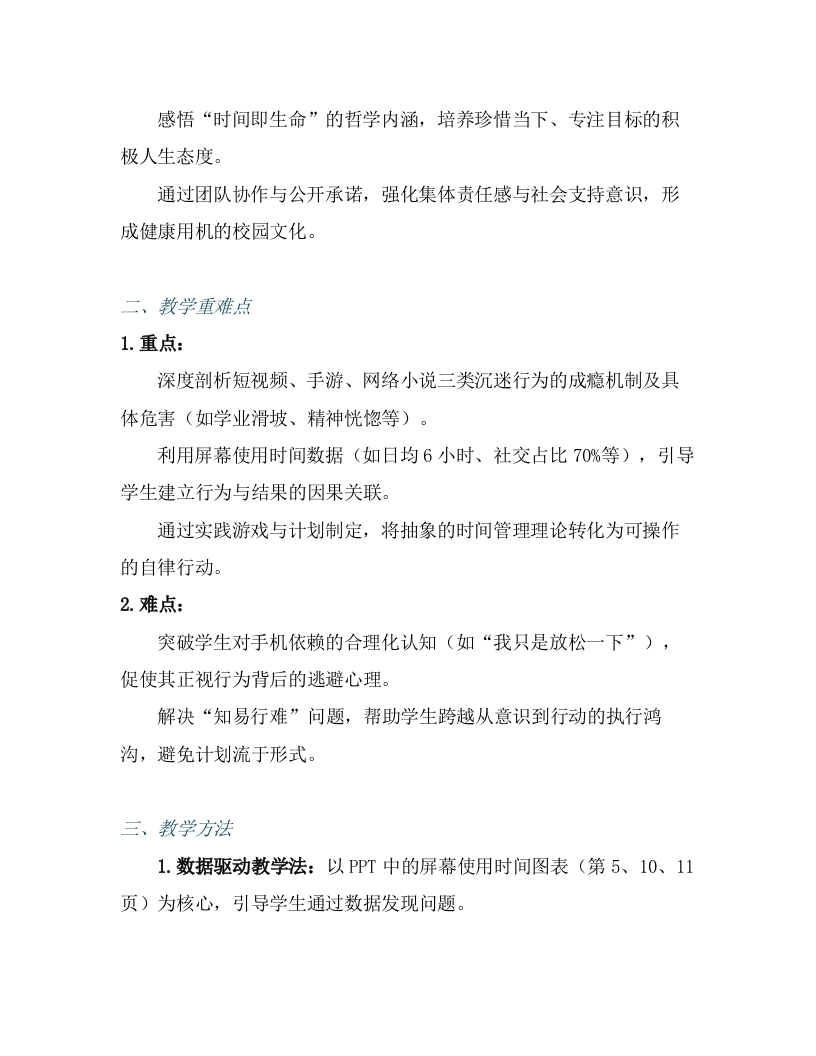《别让指尖划走青春》教案晨晨老师1个月前发布关注私信22.79KB8页03615 以下为资料部分截图预览,下载后为超高清原文件。 第1页 / 共8页 第2页 / 共8页 试读已结束,还剩6页,您可下载完整版后进行离线阅读 加入VIP,享海量教务资料,无限制免费下载所有材料 《别让指尖划走青春》教案此内容为付费资源,请付费后查看¥9.9¥15.99VIP会员免费代理(享70%分佣)免费立即购买您当前未登录!建议登陆后购买,可保存购买订单付费资源© 版权声明文章版权归作者所有,未经允许请勿转载。THE END班级管理 文本预览 《别让指尖划走青春》教案授课时长:45分钟适用年级:初中/高中一、教学目标1.知识与技能系统识别手机上瘾的三大典型表现(短视频沉迷、手游沉迷、网络小说沉迷),理解其对学习效率、身心健康及社交关系的负面影响。掌握基于数据统计的自我监控方法(如屏幕使用时间分析),学会制定并执行个性化的手机使用管理计划。通过实践游戏与案例分析,提升对时间价值的理性认知,培养科学分配碎片化时间的能力。2.过程与方法通过小组合作与辩论,锻炼批判性思维与问题解决能力,探索手机依赖的深层原因。借助“一分钟感知挑战”等体验式活动,强化对时间流逝的直观感知,打破“无意识刷手机”的行为惯性。结合图表解读与数据对比,引导学生从量化视角反思行为模式,形成数据驱动的自我管理策略。3.情感态度与价值观树立“技术为工具,而非主人”的价值观,增强抵御即时快感诱惑的意志力。 查看更多 收起部分 喜欢就支持一下吧点赞15 分享QQ空间微博QQ好友海报分享复制链接收藏