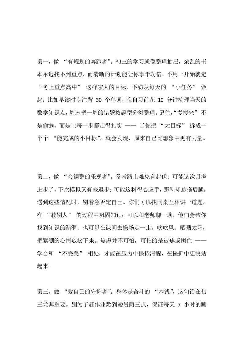 副校长在初三学生大会上讲话:“试炼场”里,我们一起向未来晨晨老师1个月前发布关注私信12.77KB3页04315 以下为资料部分截图预览,下载后为超高清原文件。 第1页 / 共3页 第2页 / 共3页 试读已结束,还剩1页,您可下载完整版后进行离线阅读 加入VIP,享海量教务资料,无限制免费下载所有材料 副校长在初三学生大会上讲话:“试炼场”里,我们一起向未来此内容为付费资源,请付费后查看¥9.99¥15.99VIP会员免费代理(享70%分佣)免费立即购买您当前未登录!建议登陆后购买,可保存购买订单付费资源© 版权声明文章版权归作者所有,未经允许请勿转载。THE END校长讲话 文本预览 副校长在初三学生大会上讲话:“试炼场”里,我们一起向未来亲爱的同学们:大家好!当教学楼前的玉兰花第三次绽满枝头,当晨跑时你们的脚步声从青涩变得沉稳,我知道,属于你们的“初三时光”已经正式拉开序幕。今天站在这里,看着你们眼中藏着的期待与些许紧张,我既想起了你们刚入初中时,抱着新书在走廊里迷路的模样,也仿佛看到了一年后,你们带着收获奔赴考场的坚定背影。初三,是初中三年最特别的一段旅程。它不是“压力”的代名词,而是你们成长中最珍贵的“试炼场”一一在这里,你们要把过去两年积累的知识梳理成网,把偶尔的迷茫转化为前行的方向,把“想放弃”的瞬间变成“再坚持一下”的勇气。我知道,最近有些同学会对着堆积的试卷皱眉,会在深夜做题时感到疲惫,也会担心“自己能不能跟上进度”。但请记住:每一个为梦想努力的清晨与深夜,都在悄悄为你们的未来铺路:每一道啃下来的难题、每一次订正的错题,都是你们给自己的“成长勋章”。今天想和大家分享三个“小提醒”,希望能帮你们更好地走过这段路: 查看更多 收起部分 喜欢就支持一下吧点赞15 分享QQ空间微博QQ好友海报分享复制链接收藏