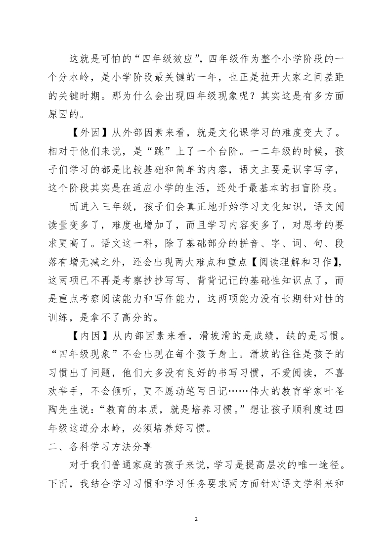 【静待花开携手同行】四年级家长会发言稿晨晨老师37天前发布关注私信22.50KB4页04611 以下为资料部分截图预览,下载后为超高清原文件。 第1页 / 共4页 第2页 / 共4页 试读已结束,还剩2页,您可下载完整版后进行离线阅读 加入VIP,享海量教务资料,无限制免费下载所有材料 【静待花开携手同行】四年级家长会发言稿此内容为付费资源,请付费后查看¥9.9¥15.99VIP会员免费代理(享70%分佣)免费立即购买您当前未登录!建议登陆后购买,可保存购买订单付费资源© 版权声明文章版权归作者所有,未经允许请勿转载。THE END班级管理 文本预览 四年级家长会各位家长朋友们,大家下午好,我是四年级1班的语文老师兼班主任蔡老师,看到大家从百忙之中抽出时间来参加家长会,可以看出大家都非常重视孩子的学习,我也感觉到我们班的家长一直都特别配合班级工作,这一点我要为大家点赞。为了这次家长会能更加顺利,我提几点会前小建议。(读1-4)本次家长会分为以下三个环节,一、我们的班级,二、各学科学习方法分享,三、家校合作。一、我们的班级首先,请大家走进我们的班级,22名男生,23名女生,构成了我们四年级1班这个团结友爱的班集体,让我们一起来观看一个视频,了解孩子们在学校是怎样度过的。四年来,我们的孩子们一步一步努力拼搏,奋勇争先,我们的班集体在各项活动中积极参与,勇争先锋。就这样,转眼间,我们的小学生活,已经走完了三分之二的路程,那么接下来的三分之一,我们要如何高质量的为小学生活画上圆满的句号呢?(二)班级发展亟待解决的问题四年级在小学阶段是孩子跨入高年级的过渡年级,也是学生自信心养成的关键时期,同时学习上也有了许多不同的学习特点。最近我们刚举行了期中考试,语文每个单元也都会有总结性测试,家长可能和孩子一样,看到成绩都有点失落。明明一二年级成绩挺好的,语文成绩每次都是八九十几分。为什么上三年级之后,成绩断崖式的下降,怎么一下子就跟不上去了?1 查看更多 收起部分 喜欢就支持一下吧点赞11 分享QQ空间微博QQ好友海报分享复制链接收藏