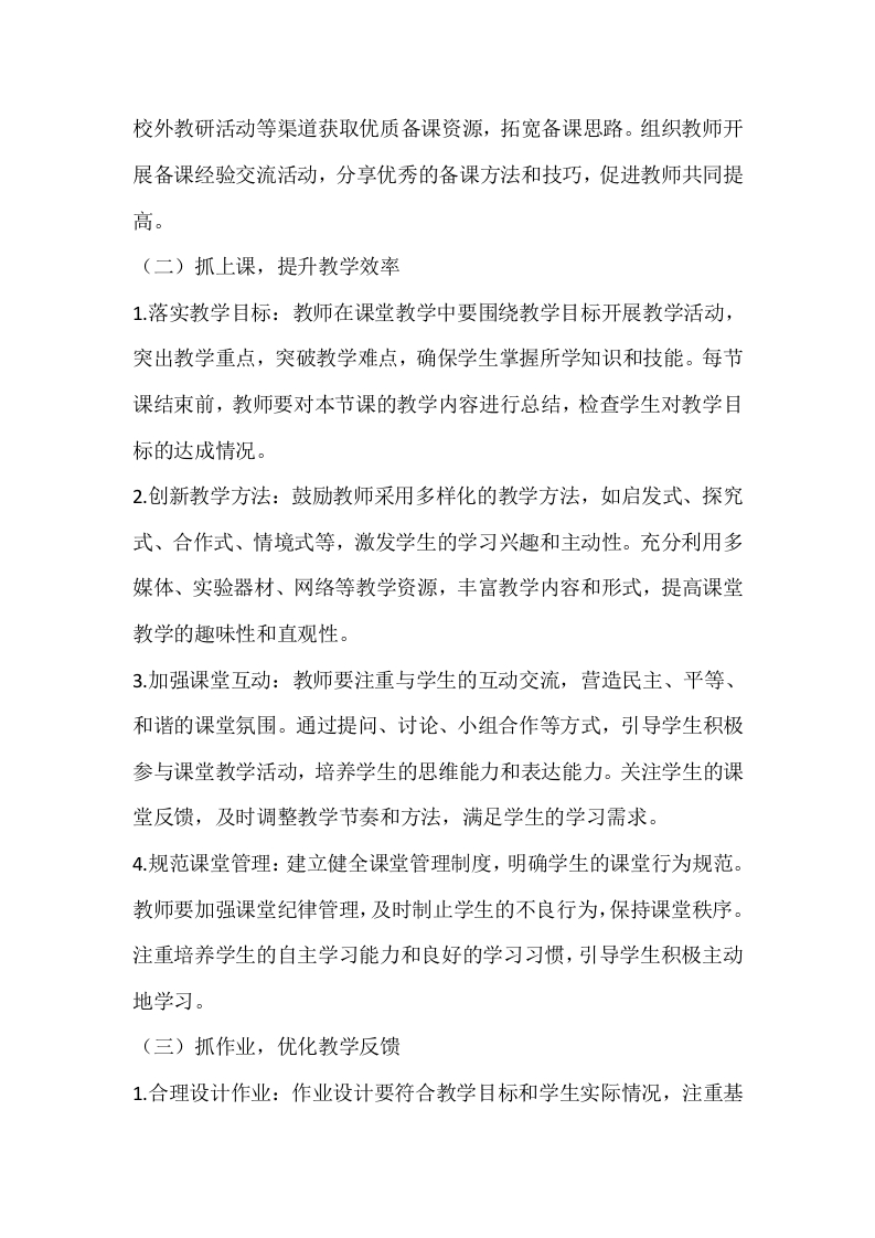 抓备课、抓上课、抓作业、抓辅导——学校教育教学质量提升方案晨晨老师38天前发布关注私信13.85KB5页0406 以下为资料部分截图预览,下载后为超高清原文件。 第1页 / 共5页 第2页 / 共5页 试读已结束,还剩3页,您可下载完整版后进行离线阅读 加入VIP,享海量教务资料,无限制免费下载所有材料 抓备课、抓上课、抓作业、抓辅导——学校教育教学质量提升方案此内容为付费资源,请付费后查看¥9.9¥15.99VIP会员免费代理(享70%分佣)免费立即购买您当前未登录!建议登陆后购买,可保存购买订单付费资源© 版权声明文章版权归作者所有,未经允许请勿转载。THE END综合资料 文本预览 抓备课、抓上课、抓作业、抓辅导一一学校教育教学质量提升方案一、总体目标通过聚焦“抓备课、抓上课、抓作业、抓辅导”四个关键环节,优化教育教学流程,提升教师教学能力,满足学生多样化学习需求,全面提高学校教育教学质量,促进学生全面发展。二、具体措施(一)抓备课,夯实教学基础1.明确备课要求:教师需深入研究课程标准、教材内容,结合学生实际情况,制定明确、可操作的教学目标。备课要突出重点、难点,设计合理的教学流程和教学方法,注重知识与技能、过程与方法、情感态度与价值观的有机融合。2加强集体备课:以年级组、学科组为单位,每周固定时间开展集体备课活动。确定主备人,主备人提前准备备课材料,在集体备课中进行讲解,其他教师共同讨论、补充,形成统一的教学思路和教案框架,同时鼓励教师根据班级实际情况进行个性化调整。3.规范备课管理:学校定期检查教师的备课教案,检查内容包括教学目标是否明确、教学流程是否合理、教学方法是否恰当、是否结合学生实际等。建立备课评价机制,对优秀的备课教案进行表彰和推广,对存在问题的备课教案提出整改意见,督促教师改进。4.丰富备课资源:学校建立教学资源库,收集整理各类教材、教参、课件、试题等备课资源,供教师查阅和使用。鼓励教师利用网络资源、 查看更多 收起部分 喜欢就支持一下吧点赞6 分享QQ空间微博QQ好友海报分享复制链接收藏