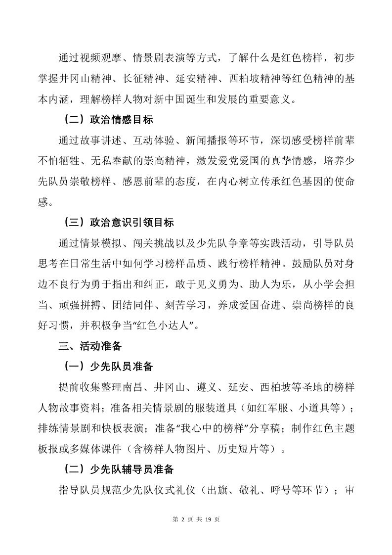 从大江南北到五湖四海——小学高段红色榜样在我心中少先队队课教案1晨晨老师29天前发布关注私信0.25MB19页04115 以下为资料部分截图预览,下载后为超高清原文件。 第1页 / 共19页 第2页 / 共19页 试读已结束,还剩17页,您可下载完整版后进行离线阅读 加入VIP,享海量教务资料,无限制免费下载所有材料 从大江南北到五湖四海——小学高段红色榜样在我心中少先队队课教案1此内容为付费资源,请付费后查看¥9.9¥15.9VIP会员免费代理(享70%分佣)免费立即购买您当前未登录!建议登陆后购买,可保存购买订单付费资源© 版权声明文章版权归作者所有,未经允许请勿转载。THE END管理方案重要节日 文本预览 从大江南北到五湖四海一小学高段红色榜样在我心中少先队队课教案一、活动背景(一)社会层面近年来我们经常在新闻媒体和学校教育中听到“榜样不朽、精神永存”的感人故事。从南昌城头的声枪响,到延安窑洞的点点灯火,再到新时代先锋的无私奉献,前辈和榜样模范的事迹广为流传,激励着全国人民奋进新时代。xxx多次勉励少年儿童“传承红色基因,争做时代新人”,号召我们铭记历史,崇尚榜样人物,让榜样精神薪火相传、代代发扬。(二)大队中队层面小学六年级的少先队员已经学过不少红色故事,对长征、抗日战争、解放战争中的榜样人物有所了解,但部分队员对这些榜样事迹的时代背景和精神内涵认识不够深刻,容易觉得榜样离我们生活很遥远。在日常学习生活中,如何将对榜样的敬仰转化为实际行动,还有待进一步引导和实践。因此,本中队决定开展以“红色榜样在我心中”为主题的少先队活动课,通过生动丰富的活动,让队员们走近圣地的榜样人物,从熟悉的榜样故事中感受红色精神力量,并学会在日常生活中践行榜样的力量。这样既弘扬爱国主义精神,又帮助队员扣好人生粒扣子,立志成为担当民族复兴大任的时代新人。二、活动目标(一)政治认知目标第1页共19页 查看更多 收起部分 喜欢就支持一下吧点赞15 分享QQ空间微博QQ好友海报分享复制链接收藏