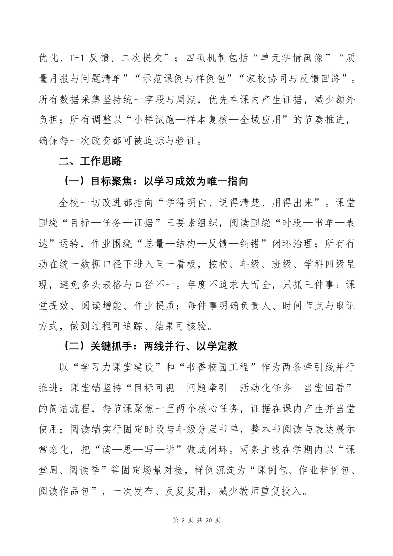 教学质量提升三年发展规划(1)晨晨老师29天前发布关注私信0.94MB20页02713 以下为资料部分截图预览,下载后为超高清原文件。 第1页 / 共20页 第2页 / 共20页 试读已结束,还剩18页,您可下载完整版后进行离线阅读 加入VIP,享海量教务资料,无限制免费下载所有材料 教学质量提升三年发展规划(1)此内容为付费资源,请付费后查看¥9.9¥15.9VIP会员免费代理(享70%分佣)免费立即购买您当前未登录!建议登陆后购买,可保存购买订单付费资源© 版权声明文章版权归作者所有,未经允许请勿转载。THE END综合资料重要节日 文本预览 教学质量提升三年发展规划一堂课的远行,一所校的同行课堂为核以学定教阅读为翼》教学质量提升三年规划证据闭环数字为器¥稳步迭代统、准、学、问、读、练、研、师、评、安、联、推统筹一盘棋882025-2026学年:打底与固化任务分解组织讨论☐目标可视■2026-2027学年》贯通一条线学2027—2028学年提质与深化定教巩固与外溢品品精施一方案精准一目标课堂阅读教研示范矩阵资源侧侧活动外溢方案演练功能调测创新构思实测验证以学定教、证据闭环、稳步送代一、指导思想围绕“以学定教、证据闭环、稳步迭代”的基本取向,把课堂学习成效放在首位,把阅读能力与表达能力作为关键支撑,把作业质量与反馈效率作为治理抓手,把教研与培训作为方法供给,把数据合规与安全运行作为底线保障。所有目标与路径均以学生可观察的学习证据为依据,以“少而准、短而实”的活动与作业承载学习过程,以“台账一看板一复盘一复检”的流程推动执行,避免口号化与一次性行动。核心落点体现在三条主线与四项机制,课堂主线强调“目标可视、问题牵引、活动化任务、当堂回看”,阅读主线强调“固定时段、分层书单、整本书检测、表达展示”,作业主线强调“总量适中、结构第1页共20页 查看更多 收起部分 喜欢就支持一下吧点赞13 分享QQ空间微博QQ好友海报分享复制链接收藏