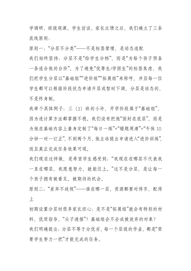 从“一张卷”到“分层练”——我校作业改革的教学协同实践与成长反思晨晨老师29天前发布关注私信16.60KB7页0535 以下为资料部分截图预览,下载后为超高清原文件。 第1页 / 共7页 第2页 / 共7页 试读已结束,还剩5页,您可下载完整版后进行离线阅读 加入VIP,享海量教务资料,无限制免费下载所有材料 从“一张卷”到“分层练”——我校作业改革的教学协同实践与成长反思此内容为付费资源,请付费后查看¥9.9¥15.9VIP会员免费代理(享70%分佣)免费立即购买您当前未登录!建议登陆后购买,可保存购买订单付费资源© 版权声明文章版权归作者所有,未经允许请勿转载。THE END作业设计重要节日 文本预览 尊敬的各位领导、教育同仁:大家好!非常荣幸今天能有这样的机会,跟在座同仁汇报并分享我校在“双减”背景下,围绕作业结构改革所做的一些实践探索与具体尝试。我们深知,深化“作业改革”是精准推进“减负提质”的一个核心支点,如果不对原有的作业观念、设计逻辑、实施流程进行整体重构,单靠压总量、降难度,是远远解决不了问题的。这两年,我校一直在围绕这样一个问题反复思考:《作业,还能不能成为学生成长的“自信源”?》当我们发现学生越来越多地以“怕写作业“不会写作业只为交差”来定义作业,那就不得不承认,传统一刀切、等量交付、纯应试目的型作业模式,到了非改不可的阶段。基于此认知,我们逐渐建立起一套自主设计、动态适配、协同实施的“分层作业管理体系”,目前已初步摸清方向、跑出路径,接下来,我将从“四个方面”简要做一份汇报:一、认清现实重新定位:我们为什么要走分层之路?推进工作要先解决“认知阻力”。改革初期,很多老师和家长对“分层作业”心存疑虑,担心是不是给学生“贴标签”,是不是变相区分“好生差生”,更担心这样会让学困生掉队、优等生“吃偏饭”。打通这个梗阻,我们想明白一件事:分层不是人为划分,而是教学对真实学情的响应。所以我们不急于设计作业内容,而是先统一理念认知。在大量教 查看更多 收起部分 喜欢就支持一下吧点赞5 分享QQ空间微博QQ好友海报分享复制链接收藏