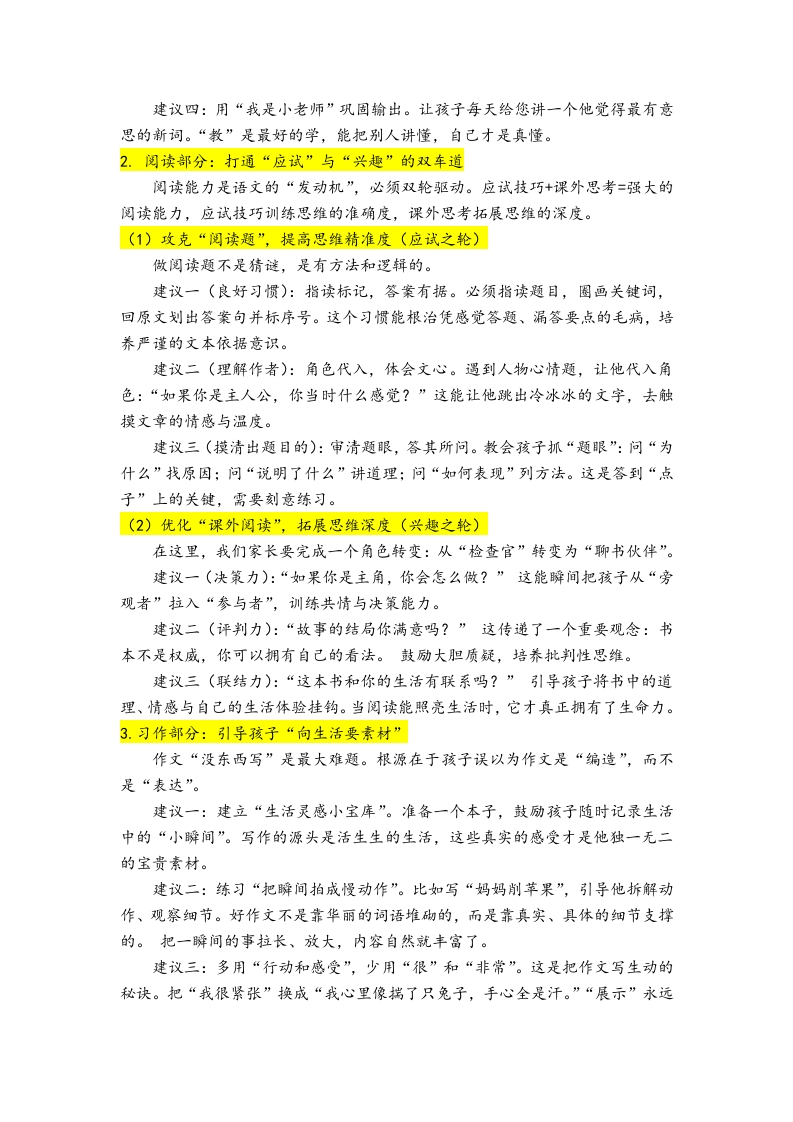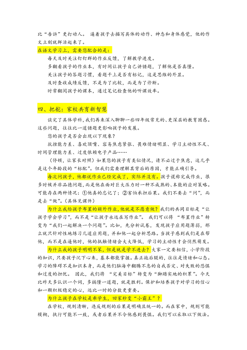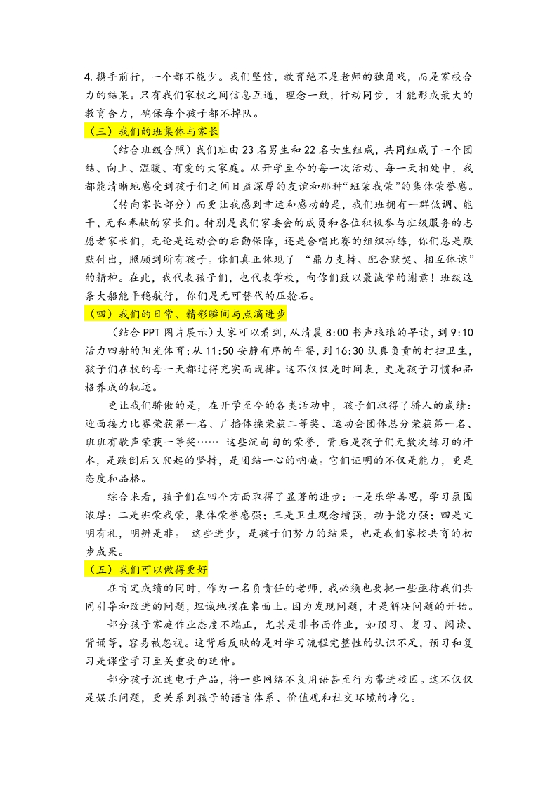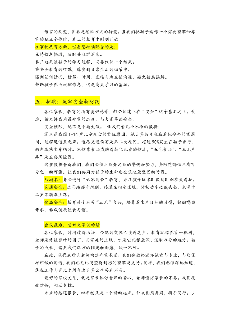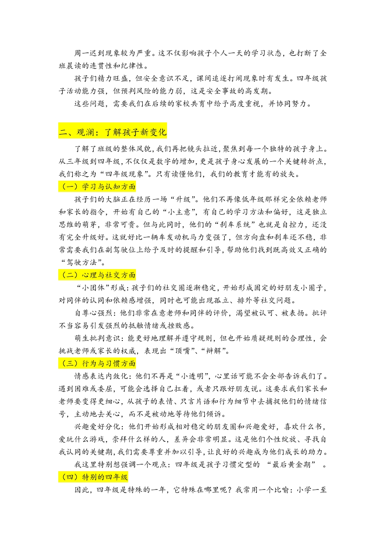 四年级上学期家长会逐字稿XX老师尊敬的各位家长:大家晚上好!我是四年级X班的班主任及语文老师,X老师。首先,请允许我代表全班所有任课老师,对各位家长在百忙之中抽出宝贵时间前来参加本次家长会,表示最热烈的欢迎和最衷心的感谢!您的到来,本身就是对我们班级工作最有力的支持,也是对我们老师最深切的信任。一、启航:展示集体新风貌好的,那么我们现在正式进入今天家长会的第一部分。俗话说“知己知彼,百战不殆”,教育孩子也一样。我们首先得了解孩子身处于一个怎样的集体中。接下来,就请大家跟随我的介绍,全方位地认识我们这个崭新的四年级X班。(一)我们的教师团队一个优秀的班级,离不开一个专业、负责、有爱的教师团队。请允许我向大家隆重介绍我们班的核心师资:除了我,小予老师,担任语文教学和班主任工作外,我们还有逻辑清晰、富有耐心的数学老师及副班主任以老师:充满活力、课堂氛围极佳的英语XX老师:以及带领孩子们探索科学奥秘的严谨而有趣的科学XX老师。我们几个人,不仅是教学上的伙伴,更是教育上的同盟,我们共同的信念就是:用心教好每一个孩子,一个都不能少。(二)我们的班级管理理念光有团队还不够,请晰的理念是班级航行的舵。在班级管理上,我们始终坚持这四条:1严在课堂,暖在课下。我们坚信,课堂上严格的纪律和要求,是保障所有孩子学习效率的基石:而课下,我们更愿意放下架子,成为孩子们的知心朋友,倾听他们的烦恼,分享他们的快乐。“严”与“暖”看似矛盾,实则统一,目标都是为了孩子的健康成长。2.看见每一个独特的你。我们拒绝“一刀切”的教育,努力去发现每个孩子身上的闪光点,也许是成绩,也许是善良,也许是领导力,也许是绘画天赋。我们的目标是让每个孩子都能在班级中找到自己的价值和位置,自信阳光地成长。3.不唯分数论高下,但以习惯定根基。尤其在四年级,我们关注的焦点,会更多地从一次考试的分数,转移到孩子学习习惯、行为习惯的养成上。一个专注听课的习惯、一个认真书写的习惯、一个每日阅读的习惯,远比一张满分的试卷,更能支撑孩子走得更远。