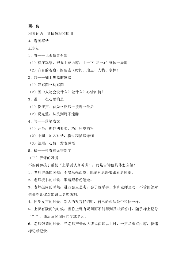 一上家长会发言稿各位家长好!我是一(1)班的班主任兼语文老师,非常感谢大家能够来参加本次家长会,也非常感谢你们对学校工作和我教学工作的理解与支持。首先我要在这特别感谢我们的张子煜妈妈,非常感谢您为我们班的付出,每次打印资料、采办班级用品都是她在张罗,那么沉的资料都是她亲自提着送到教室里的,而且还怀着孕,真的太难得了。每每和同事们说到咱们班的家长我都是特别自豪的,因为我们班的家长都孩子的成长非常用心,虽然很多东西你们也不太懂,但也在尽全力地辅导孩子们学习,如王月琳妈妈、李毕熙妍奶奶等等,群里的学习氛围也很浓厚。在孩子们出现矛盾、摩擦的时候都能和平处理。不像其他班的家长在群里吵得乌烟瘴气,见面还要挣个面红耳赤,真的非常感谢你们的理解。每次布置各种缴费任务、学习任务大家咱们班总是能又快又好地完成,我真的非常荣幸第一次当班主任就能遇到这么好的你们。也请你们放心,我一定会尽全力去教好孩子们。接下来就进行咱们本次家长会的第一个议程:一、学生学情分析二、一年级学习建议(P10-26)一年级的优秀孩子是“陪”出来的。为什么要“陪”孩子学习?一年级的孩子,学习习惯、能力和方法还处在初步发展和摸索阶段,尤其是自觉性还没有形成。在学习过程中如果没有人及时辅导,他们很难进行高效的学习。怎么“陪”孩子学习?1、营造好的学习氛围:固定的学习桌,尽量营造一个安静、不被打扰的环境。学习桌面一定要整洁,桌面乱七八糟,各种作业本堆在一起,是很难集中注意力写作业的。提前准备好学习用品,不要写到一半临时四处找。2、固定的时间:立好规矩放学回家简单休息后,优先完成家庭作业。未完成前其他一切娱乐活动免谈。3、辅导作业:一年级孩子的识字量和理解能力都还没跟上,很多题目他们