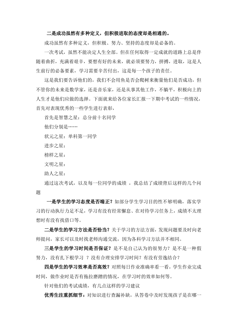 九年级期中家长会《同心助力共振飞翔》发言稿晨晨老师29天前发布关注私信27.38KB9页0505 以下为资料部分截图预览,下载后为超高清原文件。 第1页 / 共9页 第2页 / 共9页 试读已结束,还剩7页,您可下载完整版后进行离线阅读 加入VIP,享海量教务资料,无限制免费下载所有材料 九年级期中家长会《同心助力共振飞翔》发言稿此内容为付费资源,请付费后查看¥9.9¥15.9VIP会员免费代理(享70%分佣)免费立即购买您当前未登录!建议登陆后购买,可保存购买订单付费资源© 版权声明文章版权归作者所有,未经允许请勿转载。THE END班级管理 文本预览 九年级期中家长会《同心助力共振飞翔》发言稿尊敬的各位家长:大家下午好!首先我作为班主任,并代表我们班全体科任老师感谢各位家长能在百忙中抽出时间来参加这次家长会,这是你们对孩子的爱,也是对我们老师工作的支持和帮助。正是有了你们的信任、理解、支持,我们的工作才能顺利开展。因为孩子,我们彼此产生了联系,因为孩子,我们选择了双向奔赴。今天我们聚在一起,是为了能更好地为我们的孩子的学习和发展服务。在初三这样一个关键的阶段,孩子们面临着中考的压力和挑战。这时的他们需要我们的关心和支持,需要我们帮助他们应对学习和生活中的挑战,希望能够通过这次家长会,让我们教师和家长达成共识,形成合力,一起努力,为即将到来的中考做出最好的准备。几点提醒:1.请您在会议期间把手机调至静音或者关闭。2.家长会期间尽量不要接打电话。3.若有特别紧急的事情需要处理,请从后门离开教室,尽量不影响他人。第一部分回顾成绩追梦前行首先和各位家长一起来观看视频:考试不是人生的全部,致家长的一封信!相信各位家长看完视频之后,都有一些感悟,我看完得到了两点关于教育的启示,与大家共勉。一是家长要正确对待学生的考试成绩。在目前的教育环境下,作为一名家长不关注学生的成绩,是绝对不可能的,但仅仅只关注考试成绩又是绝对不可取的。考试也不是人生的全部,不是衡量成功的唯一标准。因为一场考试相对于未来的每一次人生中的每一次大考来说,根本算不了什么。一次考试低分并不能夺走他的梦想。考试无论好坏,都不值得过分看重,重要的是了解你的孩子长处和不足,与孩子一起分析,如何解决,从而为孩子指明方向和道路,多关注成绩所带来的成长让孩子充满信心学习下去,相信他们,并给予他们支持。 查看更多 收起部分 喜欢就支持一下吧点赞5 分享QQ空间微博QQ好友海报分享复制链接收藏