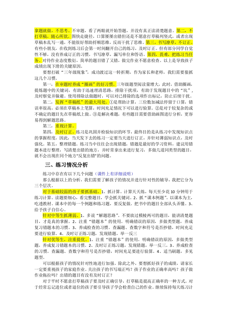 三年级数学家长会各位家长晚上好,很高兴和大家在这儿碰面,上了三年级后,偶尔会受到各位家长发来的信息,听到最多的话是孩子的知识点明明会,为什么一做起练习来,会错那么多?今天我们就利用这个时间让大家了解一下三年级的数学学科的变化。我将会从以下这三个方面入手,学期教材分析,三年级现象和练习分析及建议。一、教材分析首先,我们先来了解一下本学期的教材内容及重难点。第一单元《时分秒》,二年级的时候孩子们已经认识了时、分,本学期认识新的时间单位“秒”,本单元的难点在于单位换算以及计算经过时间、开始时间和结束时间。对我们而言,三者的关系很容易辨认,但对孩子来说,还是相对比较抽象,因此,解决这个难点,需要引导孩子借助画图进行分析。第二单元和第四单元《万以内数的加减法》以加减法计算为主,也是本学期占比较大的一部分,对孩子们的计算能力要求越来越高,因此要反复练习,保证计算过关。第三单元《测量》,重点放在单位换算。第五、六单元以乘法计算为主,初步接触乘法竖式,对后续的学习至关重要。第七单元《长方形、正方形的认识》,学生已经在之前的学习中认识过长方形和正方形的图形特点,本学期关键在于掌握图形的特点和计算公式。第八单元《分数的初步认识》,是一个全新的领域,对孩子而言也是一个比较难的单元,特别是解决问题方面,一定要多加练习。以上就是本学期的知识内容,我们了解以上的重难点,目的在于能够及时察觉孩子对哪一部分存在有薄弱的地方,能够通过我们的互相协作帮孩子一起攻克难点,防止影响后续的学习。二、三年级“断崖式”现象三年级现象是什么样子的呢?我们经常可以听到这样一句话“一二年级不相上下,三年级开始分化,四五年级天上地下”尤其可见,三年级作为一个重要的转折时期,是分水岭,具有承上启下的作用。于是,突然发现孩子身上出现了各式各样的问题,学习不够自觉,积极性不高,做作业磨磨蹭蹭,注意力不集中,逻辑思维变差,这是什么原因呢?孩子变笨了吗?不是的,一二年级时,我们根据国家要求进行双减政策,所以我们布置的家庭作业很少,加上一二年级的知识内容记忆偏多,题目不难,孩子听了课就会做。而到了三年级,很多孩子上课听不懂,作业不会做,成绩直线退步,甚至有些孩子因为退步而对学习失去信心。因此,三年级这一年需要引起大家的高度重视,要想顺利度过这一重要的转折期,我们需要对这一现象的原因进行分析。从外因上来看,三年级开始,数学学科内容急速提升。主要体现在三个方面,第一,计算量增大。一二年级时,孩子们5-10分钟能够完成一页口算,而三年级,面对复杂的三位数加减法,需要通过打草稿列竖式才能保证运算的准确度。第二,应用题难度上升。对孩子们的理解能力要求更高,题型也越来越多样,解题思维开始由一步思维向两部思维过度,需要经过“先.再”的思考过程。第三,学习方法转变。三年级开始,孩子们的思维开始由具体形象思维转变为抽象思维,不再是低年级的以机械记忆为主,而要转变为理解记忆,这个转变过程对孩子们来说确实是具备一定的难度。那么从内因来看,之所以出现三年级“断崖”现象,实际是学习习惯使然。第一,