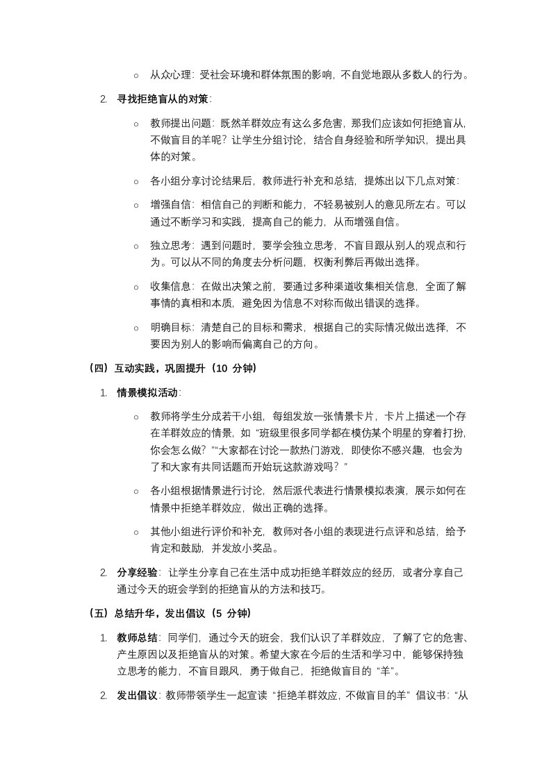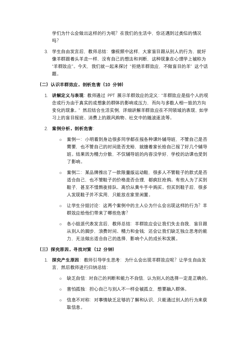 “拒绝羊群效应,不做盲目的羊”主题班会教案一、教学目标1.认知目标:学生能够清晰阐述羊群效应的定义、表现形式及产生原因,了解其在学习、生活、消费等多个领域的具体体现。2.能力目标:通过案例分析和实践活动,培养学生独立思考、批判性思维的能力,学会在面对群体行为时,结合自身实际做出合理判断和选择。3.情感态度与价值观目标:引导学生树立自主、理性的生活和学习态度,增强自我意识和独立人格,拒绝盲目跟风,勇于展现独特的自我。二、教学重难点1.教学重点:让学生深刻理解羊群效应的本质和危害,掌握拒绝盲从、保持独立思考的方法。2.教学难点:帮助学生将所学知识转化为实际行动,在日常生活中真正做到不言目跟风,坚持独立判断。三、教学对象初中/高中学生四、教学时长45分钟五、教学准备1.制作“拒绝羊群效应,不做盲目的羊"主题班会PPT,包含图片、视频、案例等素材。2.准备情景卡片、小奖品(如书签、笔记本等)。3.提前布置学生观察生活中的羊群效应现象,记录1-2个实例。六、教学过程(一)情境导入,引出主题(5分钟)1.播放一段短视频:视频中展示了这样几个场景,上学时,看到很多同学都买了某款流行的文具,不管自己是否需要,也缠着家长购买;课堂上,老师提问个有争议的问题,大部分同学都选择了同一个答案,少数有不同想法的同学犹豫后也跟着改变了自己的选择;周末逛街,看到一家奶茶店门口排起长队,很多人明明不渴,也跟着排队购买。2.提问引导:同学们,看完这段视频,大家有没有似曾相识的感觉?视频中的同