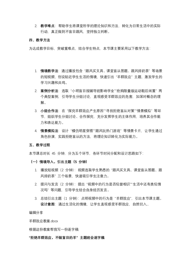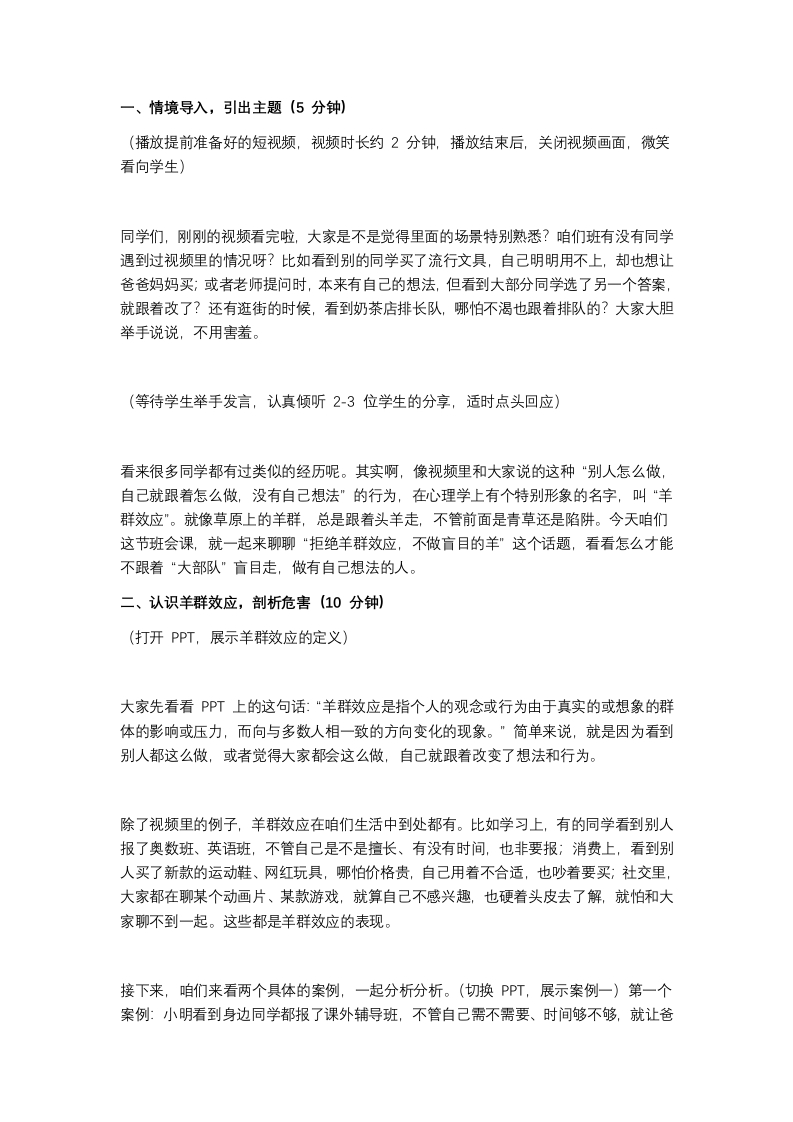 羊群效逐字稿晨晨老师27天前发布关注私信21.68KB6页0369 以下为资料部分截图预览,下载后为超高清原文件。 第1页 / 共6页 第2页 / 共6页 第3页 / 共6页 试读已结束,还剩3页,您可下载完整版后进行离线阅读 加入VIP,享海量教务资料,无限制免费下载所有材料 羊群效逐字稿此内容为付费资源,请付费后查看¥9.9¥15.9VIP会员免费代理(享70%分佣)免费立即购买您当前未登录!建议登陆后购买,可保存购买订单付费资源© 版权声明文章版权归作者所有,未经允许请勿转载。THE END综合资料 文本预览 “拒绝羊群效应,不做盲目的羊”主题班会说课稿各位老师好!今天我说课的主题是“拒绝羊群效应,不做盲目的羊”,将从教材与学情分析、教学目标、教学重难点、教学方法、教学过程、教学反思六个方面展开阐述,旨在说明如何通过一节45分钟的班会课,引导初高中学生认清羊群效应,培养独立思考能力。一、教材与学情分析从教学内容来看,“羊群效应”是心理学中与学生生活紧密相关的概念,涵盖学习、消费、社交等多个领域。本节课的教学内容并非来自传统学科教材,而是结合学生日常行为现象设计,具有很强的实践性和现实意义,能帮助学生将心理学知识应用于生活,解决“目跟风”这一常见问题。从学情来看,初高中学生正处于自我意识发展的关键阶段,既渴望融入群体,又开始追求个性独立。但由于缺乏社会经验和独立判断能力,容易受群体影响出现盲从行为,比如跟风报辅导班、抢购流行商品、模仿他人言行等。同时,这一年龄段的学生思维活跃,对视频、案例、情景模拟等互动式教学形式更感兴趣,具备一定的小组合作和表达能力,为课堂活动的开展奠定了基础。二、教学目标基于对教学内容和学情的分析,我将本节课的教学目标分为认知、能力、情感态度与价值观三个维度:1.认知目标:让学生清晰阐述羊群效应的定义,识别其在学习(如盲目报班)、生活(如跟风购物)、社交(如随波逐流)等领域的表现形式,理解其产生的原因(缺乏自信、害怕孤独、信息不对称、从众心理)。2.能力目标:通过案例分析和情景模拟等活动,培养学生独立思考、批判性思维的能力,使其学会在面对群体行为时,结合自身实际做出合理判断和选择。3.情感态度与价值观目标:引导学生树立自主、理性的生活和学习态度,增强自我意识和独立人格,拒绝盲目跟风,勇于展现独特的自我。三、教学重难点1.教学重点:让学生深刻理解羊群效应的本质(个人受群体影响向多数人行为靠拢)及危害(浪费时间精力、阻碍个人成长等),掌握拒绝盲从、保持独立思考的方法(增强自信、独立思考、收集信息、明确目标)。 查看更多 收起部分 喜欢就支持一下吧点赞9 分享QQ空间微博QQ好友海报分享复制链接收藏
