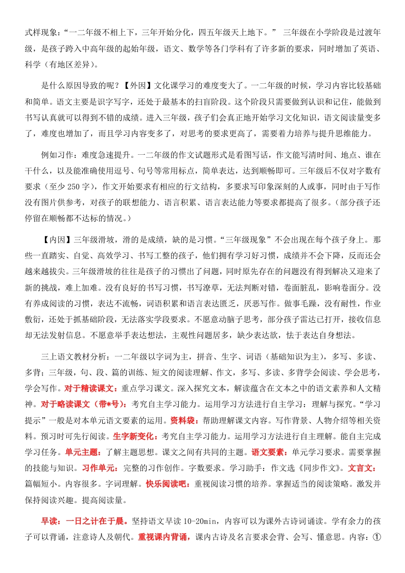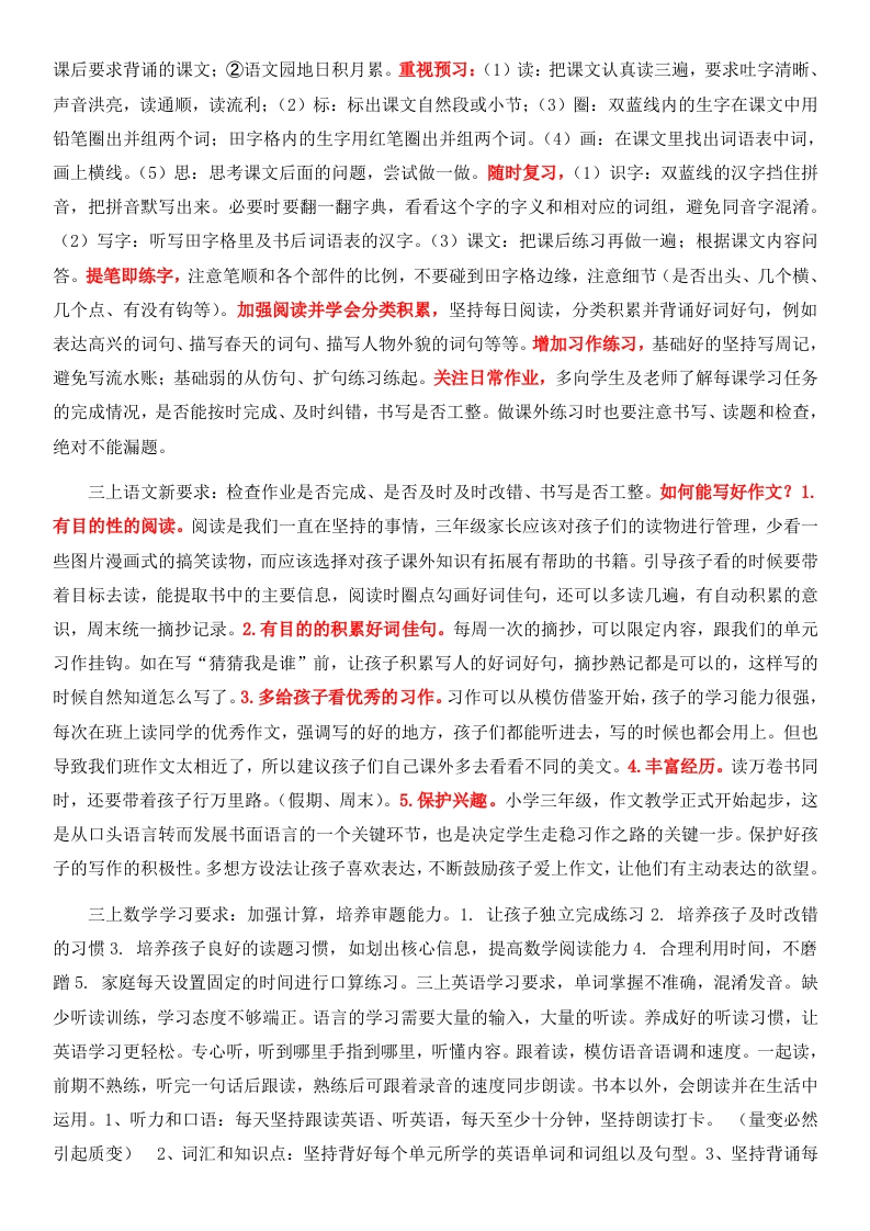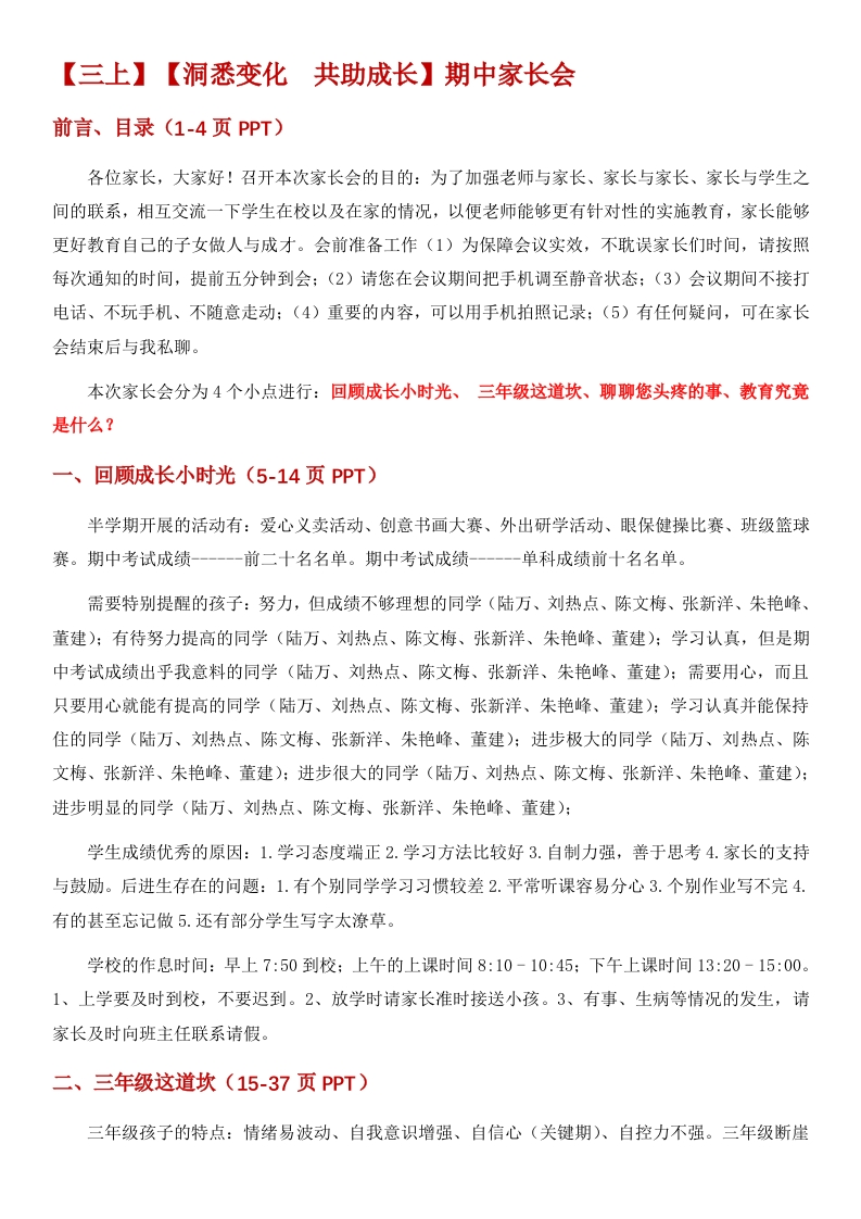 【三上】【洞悉变化共助成长】期中家长会前言、目录(1-4页PPT)各位家长,大家好!召开本次家长会的目的:为了加强老师与家长、家长与家长、家长与学生之间的联系,相互交流一下学生在校以及在家的情况,以便老师能够更有针对性的实施教育,家长能够更好教育自己的子女做人与成才。会前准备工作(1)为保障会议实效,不耽误家长们时间,请按照每次通知的时间,提前五分钟到会:(2)请您在会议期间把手机调至静音状态:(3)会议期间不接打电话、不玩手机、不随意走动:(4)重要的内容,可以用手机拍照记录:(5)有任何疑问,可在家长会结束后与我私聊。本次家长会分为4个小点进行:回顾成长小时光、三年级这道坎、聊聊您头疼的事、教育究竟是什么?一、回顾成长小时光(5-14页PPT)半学期开展的活动有:爱心义卖活动、创意书画大赛、外出研学活动、眼保健操比赛、班级篮球赛。期中考试成绩---一前二十名名单。期中考试成绩---一单科成绩前十名名单。需要特别提醒的孩子:努力,但成绩不够理想的同学(陆万、刘热点、陈文梅、张新洋、朱艳峰、董建):有待努力提高的同学(陆万、刘热点、陈文梅、张新洋、朱艳峰、董建):学习认真,但是期中考试成绩出乎我意料的同学(陆万、刘热点、陈文梅、张新洋、朱艳峰、董建):需要用心,而且只要用心就能有提高的同学(陆万、刘热点、陈文梅、张新洋、朱艳峰、董建):学习认真并能保持住的同学(陆万、刘热点、陈文梅、张新洋、朱艳峰、董建):进步极大的同学(陆万、刘热点、陈文梅、张新洋、朱艳峰、董建):进步很大的同学(陆万、刘热点、陈文梅、张新洋、朱艳峰、董建):进步明显的同学(陆万、刘热点、陈文梅、张新洋、朱艳峰、董建):学生成绩优秀的原因:1.学习态度端正2.学习方法比较好3.自制力强,善于思考4.家长的支持与鼓励。后进生存在的问题:1.有个别同学学习习惯较差2.平常听课容易分心3.个别作业写不完4.有的甚至忘记做5.还有部分学生写字太潦草。学校的作息时间:早上7:50到校:上午的上课时间8:10-10:45:下午上课时间13:20-15:00。1、上学要及时到校,不要迟到。2、放学时请家长准时接送小孩。3、有事、生病等情况的发生,请家长及时向班主任联系请假。二、三年级这道坎(15-37页PPT)三年级孩子的特点:情绪易波动、自我意识增强、自信心(关键期)、自控力不强。三年级断崖