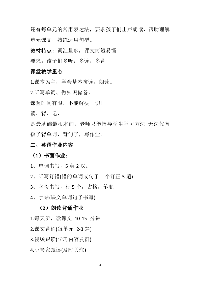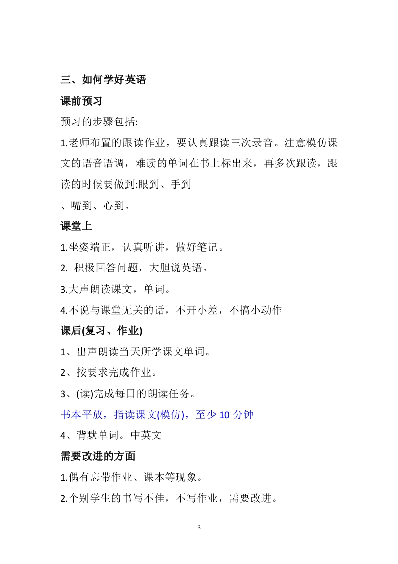 尊敬的各位家长:大家好!非常感谢大家在百忙之中抽出时间来参加这次三年级英语家长会。今天,我想围绕新教材怎么学、英语作业内容、如何学好英语,以及给家长的建议这四个方面和大家做一个交流。一、新教材怎么学三年级是孩子正式系统学习英语的起始阶段,我们使用的新教材具有鲜明的特点。首先每个单元分为A,B,C。A部分对话要求孩子们能够背诵,背一句可以翻译一句。并结合的有课文背诵闯关表。A部分词汇课是本单元的核心词汇部分,要求孩子们熟读,并在四线三格中正确书写,单词要求默写1英1汉。A部分的语音学习,要求孩子们能够熟读含有字母发音的单词,并正确的书写本部分字母。B部分和A部分一样,含有一个对话课和词汇课,要求也是一样。B部分语篇是整合本单元的重点句型形成的文本理解,要求孩子们知道意思,读懂文本内容。C部分不是重点,只要求孩子们跟随课堂,做好相应的练习。最后的reading time,出声朗读故事,掌握出现的新单词。每单元的词汇表,是学习的重点,要求孩子们,熟读并进行背诵。