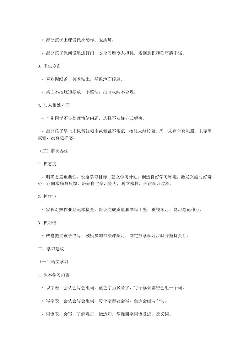 过五关攀书山绘锦途五年级期中家长会晨晨老师27天前发布关注私信10.75KB4页0415 以下为资料部分截图预览,下载后为超高清原文件。 第1页 / 共4页 第2页 / 共4页 试读已结束,还剩2页,您可下载完整版后进行离线阅读 加入VIP,享海量教务资料,无限制免费下载所有材料 过五关攀书山绘锦途五年级期中家长会此内容为付费资源,请付费后查看¥9.9¥15.9VIP会员免费代理(享70%分佣)免费立即购买您当前未登录!建议登陆后购买,可保存购买订单付费资源© 版权声明文章版权归作者所有,未经允许请勿转载。THE END综合资料 文本预览 这篇文章是关于五年级下学期期中家长会的总结,涵盖了班级情况、期中分析、学习建议、家校共育和安全教育等多个方面。一、班级概况·基本情况:共有54名同学,男生28人,女生26人。大多数学生懂事、听话,在个人习惯和学习方面取得进步,班内团结友爱,形成了良好班风和学风。·日常表现。课间:活跃、友好。。作业:认真、准确。。早读:自觉且认真。。两操:安静且有序。。课堂:高效且积极。。值日:团结且迅速。二、期中分析(一)总体情况总体尚可,优秀率较高,但存在一些问题。(二)存在问题1.学习方面。基础知识不扎实,上课分神。部分孩子对作业不重视,存在书写不认真、订正不及时、迟交或缺交等情况。。部分孩子未养成倾听他人发言的习惯,课堂上不会听讲,走神,完成课堂任务拖拉,缺乏学习自觉性。。午餐午休时个别同学睡不着,搞小动作。。部分孩子学习态度不端正,早读不愿张嘴大声朗读,有迟到情况,姿势不端正。2.纪律方面 查看更多 收起部分 喜欢就支持一下吧点赞5 分享QQ空间微博QQ好友海报分享复制链接收藏