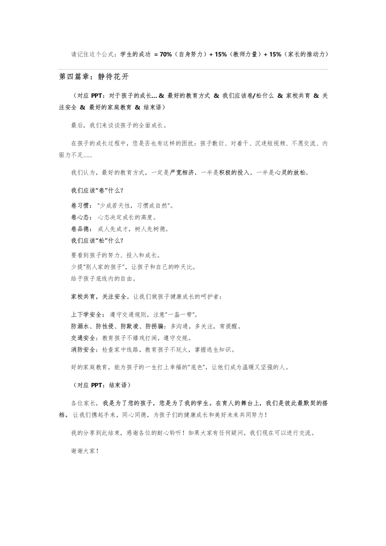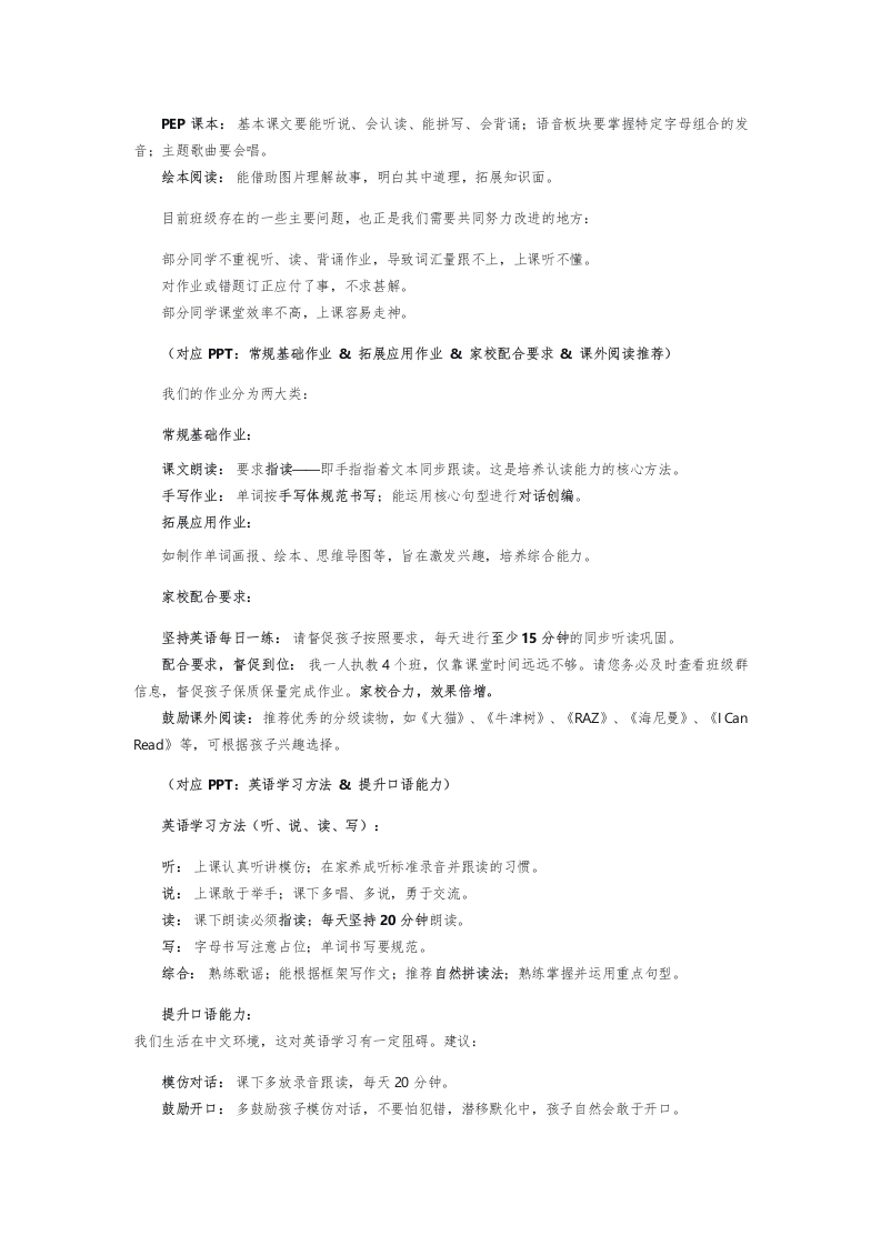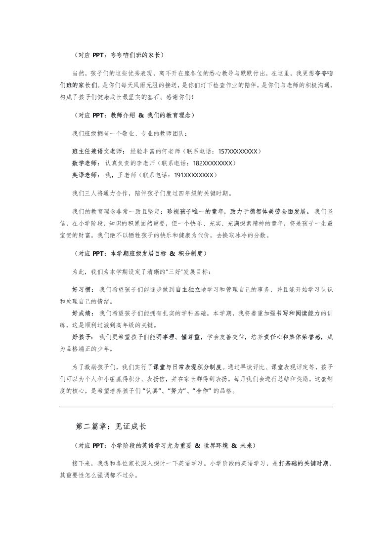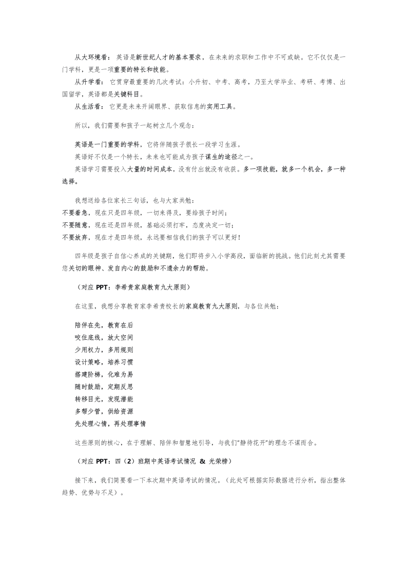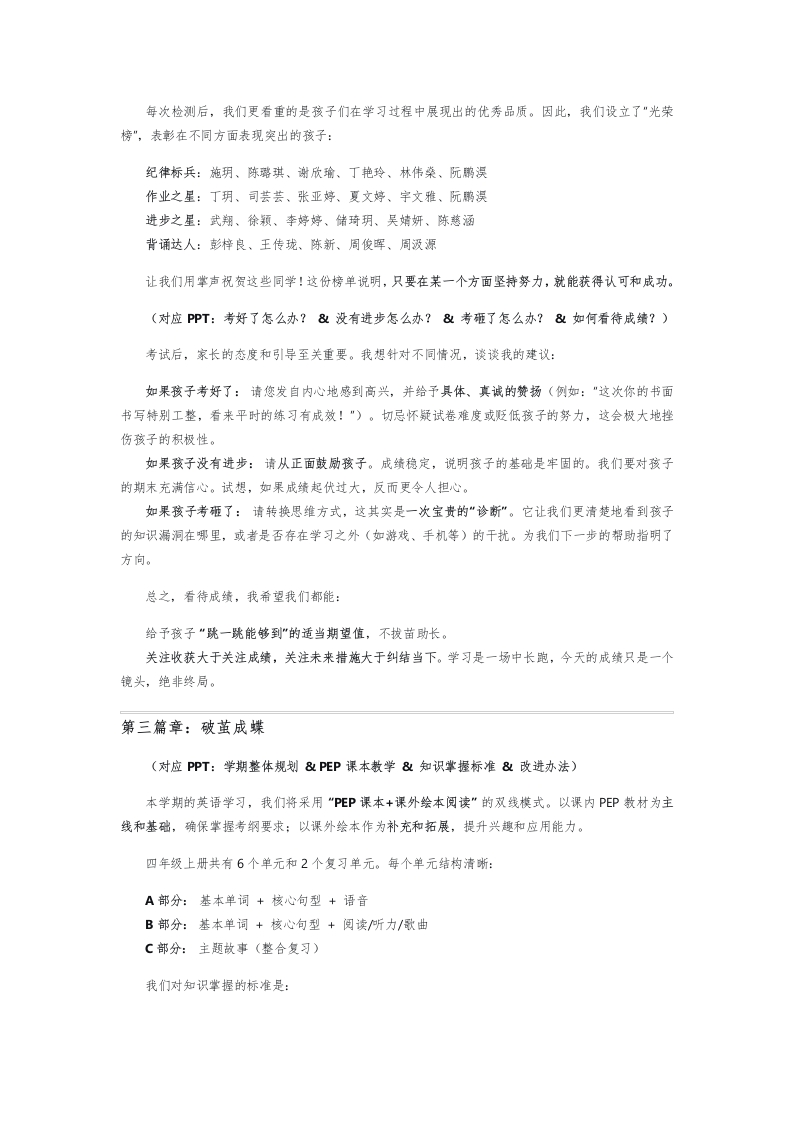 “英”爱相聚,“语“您同行一四年级上学期家长会发言稿(对应PPT封面页:英爱相聚,静待花开)尊敬的各位家长朋友:大家晚上好!我是咱们四年级(2)班的英语老师,王老师。看到这么多家长准时到来,我内心充满了感动。今晚,我们因为一份共同的爱而相聚在这里一那就是对孩子们无私的关爱与期待。我们的主题是“英爱相聚,静待花开“,我坚信,在教育孩子的路上,只要我们家校携手,用心浇灌,就一定能够静待每一朵生命之花的绚烂绽放。(对应PPT目录页)为了让我们的交流更清晰,我将今晚的分享分为四个篇章:第一篇章:初识萌芽一让我们共同感受班级的温暖与活力,明确我们的共同目标。第二篇章:见证成长一我们将一起回顾孩子们开学以来的点滴进步,并重点探讨四年级英语学习的重要性。第三篇章:破茧成蝶一这是今晚的核心,我将详细介绍本学期的英语教学规划、学习方法,以及我们需要如何配合。第四篇章:静待花开一我们将一起探讨如何成为孩子成长中最坚实的后盾,包括家庭教育理念和安全教育。第一篇章:初识萌芽(对应PPT:夸夸咱们班的孩子&我们的班级)首先,我想带大家走进我们温暖的集体。我们班由23位聪慧可爱的女生和22位阳光勇敢的男生组成,一共45名成员。这不仅仅是一个数字,更是45个鲜活、独特的个体。他们共同组成了一个充满勇敢、自信、团结、友爱、创新精神的大家庭。开学至今,孩子们的表现给了我许多惊喜,请允许我由衷地夸夸他们:在课堂上,他们眼神专注,积极思考,踊跃发言。作业能够高效、认真地完成,展现了良好的学习习惯。值日时,他们分工合作,把我们的教室打扫得窗明几净。课问,他们活泼有趣,懂得安全游戏,笑声充满了走廊。早操时,他们步伐整齐,口号响亮,活力四射。特别让我感动的是,课后总有不少孩子围着我,不是为了玩,而是为了“老师,这个地方我还不懂,您能再讲讲吗?“这种主动求知的精神,是学习路上最宝贵的财富。