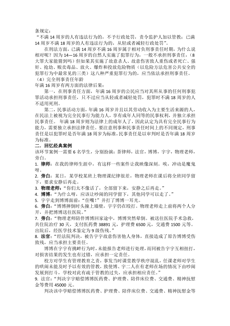 律师回忆录一青少年普法班会班会简介:本次班会是以一位律师回忆的视角,从四个方面教育现在的青少年,让他们知法、懂法,通过案例分析让学生明白生活中可能发生的事情以及法院判决的后果。从而约束自己的行为。班会流程:一.回忆学习历程该环节需要3名同学,一名记者,一名律师,一名小助手。1.记者:“我们茶律师是位经验丰富的资深律师,在社会各界都享有盛誉,特别精通青少年犯罪问题,请问您是如何做到的呢?给我们这些后辈分享一下经验吧。”2.律师:“咳,咳,哎呀,那些都是虚名,我只是尽我所能帮助这些孩子们,让他们认识到自己的错误,能迷途知返。想要成为一名优秀的律师,首先得熟知我国各种律法。”3.律师:“我们国家现在有《宪法》、《民法通则》、《民事诉讼法》、《继承法》、《继承法》、《刑法》、《刑事诉讼法》、《婚姻法》、《兵役法》、《经济合同法》、《义务教育法》、《治安管理处罚条例》、《环境保护法》、《未成年人保护法》、《交通管理法规》”4.律师:“与未成年人相关的法律主要有哪些呢?(1)《义务教育法》(2)《预防未成年人犯罪法》(3)《收养法》(4)《刑法》(5)《民法》(6)《治安管理处罚条例》(7)《未成年人保护法》。5.律师:“现在许多孩子误入歧途,也是因为不清楚法律责任年龄,总以为自己还小,做事不计后果。现在由我的小助理来告诉大家一些法律责任年龄。”6.小助理:(1)未成年人:指未满十八周岁的公民,未成年人是相对于成年人而言的,以生理年龄作为界定未成年人的标准,通常以户口簿记载的出生日期为准,按公历计算。根据我国法律的规定,10岁、14岁、16岁、18岁分别具有的法律意义。(法律概念:刑事责任年龄是指对违法行为负刑事责任的年龄范围。)(2)完全无刑事责任年龄:也就是不满14周岁的自然人,对其实施的任何行为都不负刑事责任。这里再附带提一下民事行为能力的划分(民事行为能力是指民事主体能以自己的行为取得民事权利、承担民事义务的资格),不满10周岁的公民是无民事行为能力人:10周岁以上的未成年人是限制民事行为能力人,可以进行与他的年龄、智力相适应的民事活动,其他民事活动由他的法定代理人代理,或者征得其法定代理人的同意。通常来说,在法律上通过其从事民事活动金额的大小,与其生活的关联程度等方面,来判断其所从事的民事活动是否有效,如10周岁以上的小学生买文具就具有合法性。(3)不完全无刑事责任年龄:公民年满14周岁,在民事法律方面没有特别的法律意义,但在行政法和刑法上具有特殊意义。行政法上如《行政处罚法》第25