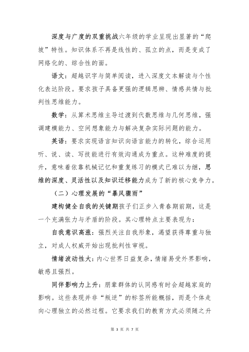 六年级家长会行稳致远筑梦未来发言稿晨晨老师2个月前发布关注私信0.23MB7页0446 以下为资料部分截图预览,下载后为超高清原文件。 第1页 / 共7页 第2页 / 共7页 第3页 / 共7页 试读已结束,还剩4页,您可下载完整版后进行离线阅读 加入VIP,享海量教务资料,无限制免费下载所有材料 六年级家长会行稳致远筑梦未来发言稿此内容为付费资源,请付费后查看¥9.9¥15.9VIP会员免费代理(享70%分佣)免费立即购买您当前未登录!建议登陆后购买,可保存购买订单付费资源© 版权声明文章版权归作者所有,未经允许请勿转载。THE END综合资料 文本预览 尊敬的各位家长朋友:大家晚上好!我是六年级(X)班的班主任夏老师。首先,请允许我代表学校及全体科任教师,对各位来参加本次家长会,表示最诚挚的感谢与最热烈的欢迎。今天的相聚,源于我们共同的一份牵挂、一份责任,更源于对孩子们灿烂未来的无限期许。教育,从来不是一场独奏,而是一场和谐的交响。小学六年,行至今日,已步入最为关键的华彩乐章。本次家长会,我希望它不是一次单向的汇报,而是一场双向的奔赴、一次深度的“战略研讨”。我们将一同回顾成长的足迹,剖析当下的机遇与挑战,并共同擘画通往未来的路线图。我们的核心目标高度一致:如何凝聚家校最强合力,为孩子们的六年级征程全面赋能,助力他们以自信、从容、饱满的姿态,为小学时光画上圆满句号,并满怀信心地奔赴人生的下一场山海。(一)回望·成长颂歌:看见进步,珍视闪光在聚焦挑战与策略之前,请允许我带领大家,将目光首先投向孩子们已经创造的成长奇迹。作为他们成长的见证者,我内心充满了欣慰与自豪。(一)从“被动接受”到“主动探求”的质变相较于中低年级,我们欣喜地看到,一种可贵的“主体性”在孩子们身上蓬勃生长。他们不再仅仅满足于“被告知”,第1页共7页 查看更多 收起部分 喜欢就支持一下吧点赞6 分享QQ空间微博QQ好友海报分享复制链接收藏