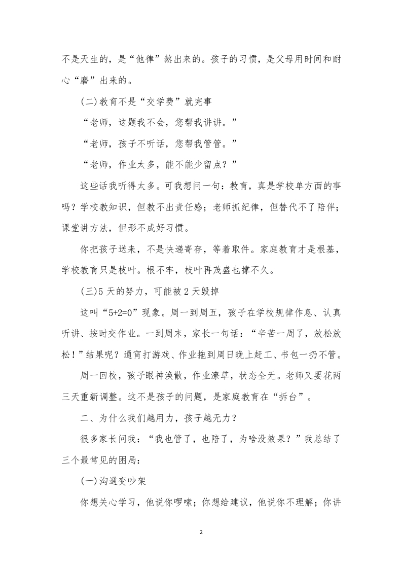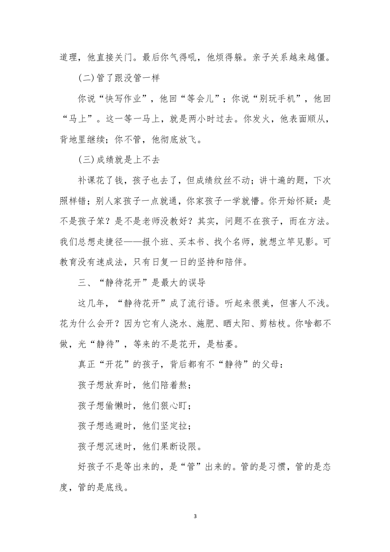 期中家长家长会(教育孩子)发言稿晨晨老师7天前发布关注私信0.21MB7页04713 以下为资料部分截图预览,下载后为超高清原文件。 第1页 / 共7页 第2页 / 共7页 第3页 / 共7页 试读已结束,还剩4页,您可下载完整版后进行离线阅读 加入VIP,享海量教务资料,无限制免费下载所有材料 期中家长家长会(教育孩子)发言稿此内容为付费资源,请付费后查看¥9.9¥15.9VIP会员免费代理(享70%分佣)免费立即购买您当前未登录!建议登陆后购买,可保存购买订单付费资源© 版权声明文章版权归作者所有,未经允许请勿转载。THE END综合资料 文本预览 教育孩子,本质上是教育自己—2025-2026学年上学期期中家长会尊敬的各位家长:大家好!今天这场家长会,咱们不走形式,不念稿子,也不说那些“孩子都很棒”“未来可期”的客套话。咱们就坐下来,掏心窝子聊一聊:关于教育,我们到底在怕什么?我们在焦虑什么?又有哪些一直回避、却不得不面对的真相?我知道你们为孩子操碎了心,报班、陪读、盯作业,样样没落下。但结果呢?成绩没起色,亲子关系还越来越紧张。不是你们不够努力,而是我们可能从一开始就搞错了方向。今天,我不讲大道理,只讲实话。话可能难听,但句句来自一线教学的真实观察。良药苦口利于病,忠言逆耳利于行。咱们坦诚相见,才能真正帮到孩子。一、先说三个扎心但必须正视的真相(一)“自觉的孩子”,背后都有“不轻松”的父母我教过上千个学生,说实话,真正能长期自律、主动学习的孩子,凤毛麟角。那些看起来“不用管”的孩子,背后一定有父母日复一日的“狠心”坚持。他能按时写完作业,是因为妈妈每天雷打不动地检查计划表;他能专注听课,是因为爸爸从小就规定手机使用时间;他能坚持阅读,是因为全家晚饭后都放下手机,各自看书半小时。别信“静待花开”那一套。花不开,往往是因为没人浇水。自律 查看更多 收起部分 喜欢就支持一下吧点赞13 分享QQ空间微博QQ好友海报分享复制链接收藏