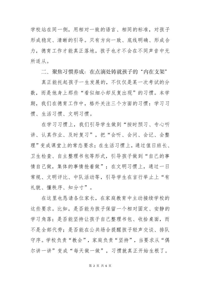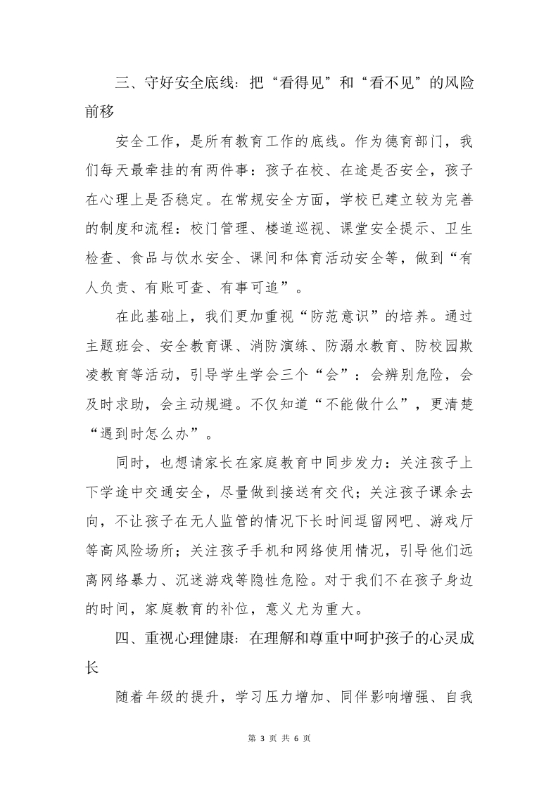 2025年家长会德育主任讲话稿——深秋共话成长,同心奔向未来晨晨老师7天前发布关注私信0.23MB6页05114 以下为资料部分截图预览,下载后为超高清原文件。 第1页 / 共6页 第2页 / 共6页 第3页 / 共6页 试读已结束,还剩3页,您可下载完整版后进行离线阅读 加入VIP,享海量教务资料,无限制免费下载所有材料 2025年家长会德育主任讲话稿——深秋共话成长,同心奔向未来此内容为付费资源,请付费后查看¥9.9¥15.9VIP会员免费代理(享70%分佣)免费立即购买您当前未登录!建议登陆后购买,可保存购买订单付费资源© 版权声明文章版权归作者所有,未经允许请勿转载。THE END量化制度 文本预览 2025年家长会德育主任讲话稿一深秋共话成长,同心奔向未来各位家长朋友、各位老师:大家下午好!很高兴在这样一个时间节点,与大家相聚在这间教室。首先,谨代表学校德育处,向一直关心、理解和支持学校工作的各位家长,表示衷心的感谢!孩子在校的每一点进步,都离不开老师的用心引导,更离不开家长在背后的默默付出。今天的家长会,不是简单的“通报情况”,更是一次家校同堂的“育人会”“共识会”。一、统一理念:把“立德树人”落实到每一个细节里在整个学校工作中,德育不是“附属品”,而是“方向盘”。我们常说,成绩决定孩子能走多快,品格决定孩子能走多远。从学校的角度看,本学期以来,我们所有日常管理、活动设计、班级文化建设,都是围绕一个核心在展开一一立德树人,培养“品行端正、心态阳光、习惯良好、懂得感恩”的孩子。谈到德育理念,我想用三个关键词与各位交流:“方向”“底线”“合力”。“方向”,就是在价值观上始终坚持把孩子引向正直、善良、有责任感的路上,不功利、不短视:“底线”,就是在安全规范、行为习惯、文明礼仪上,坚持有原则、有要求,不纵容、不放任;“合力”,就是家庭与第1页共6页 查看更多 收起部分 喜欢就支持一下吧点赞14 分享QQ空间微博QQ好友海报分享复制链接收藏