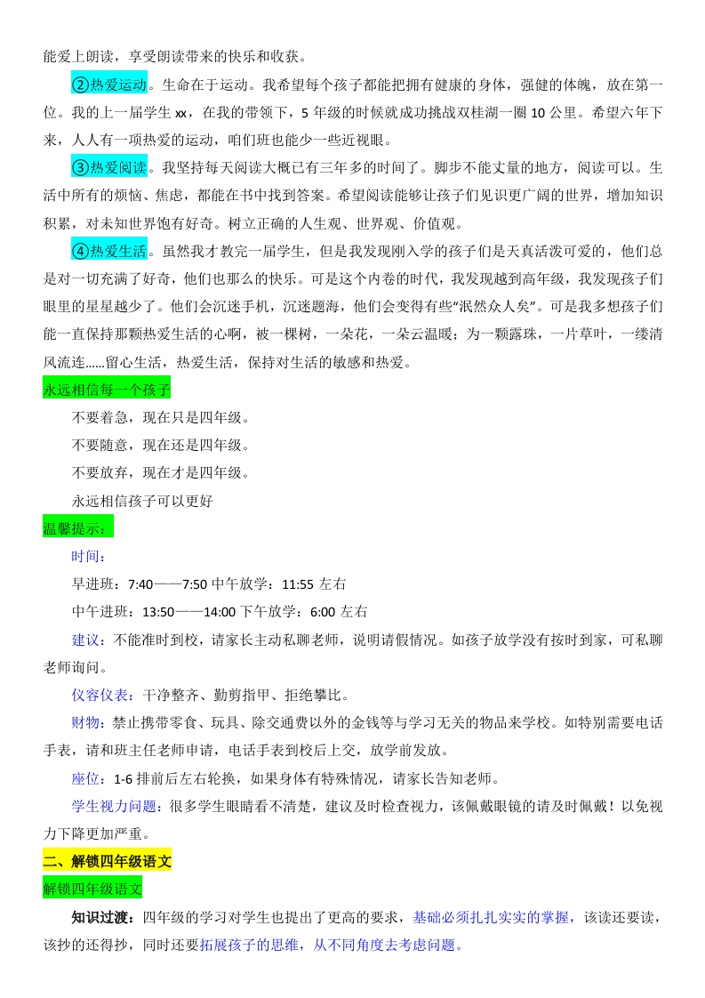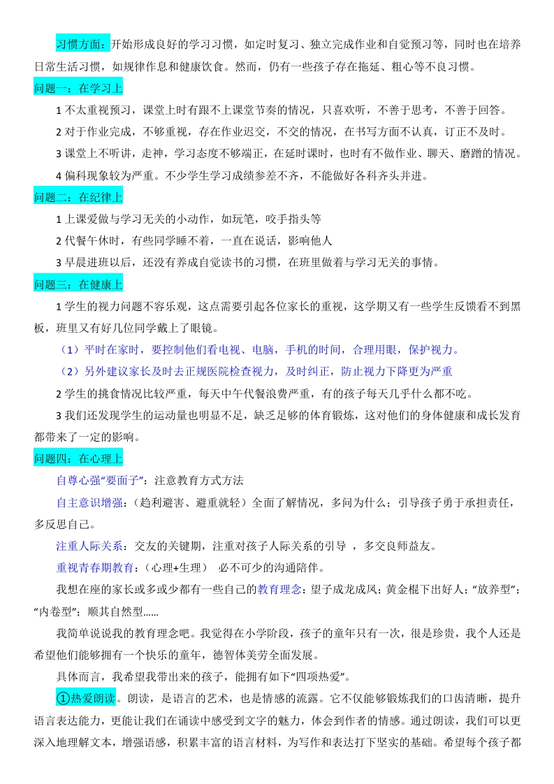 【四年级】【秋季上】【语文】开学家长会:用爱承载未来发言稿晨晨老师5天前发布关注私信32.36KB12页0448 以下为资料部分截图预览,下载后为超高清原文件。 第1页 / 共12页 第2页 / 共12页 第3页 / 共12页 试读已结束,还剩9页,您可下载完整版后进行离线阅读 加入VIP,享海量教务资料,无限制免费下载所有材料 【四年级】【秋季上】【语文】开学家长会:用爱承载未来发言稿此内容为付费资源,请付费后查看¥9.9¥15.9VIP会员免费代理(享70%分佣)免费立即购买您当前未登录!建议登陆后购买,可保存购买订单付费资源© 版权声明文章版权归作者所有,未经允许请勿转载。THE END综合资料 文本预览 【四上】【语文】【用爱承载未来】开学家长会发言稿前言孩子们是我们的希望,是家庭的未来,更是社会的宝贵财富。他们如同初升的太阳,充满着无限的可能和活力。我们肩负着用爱去滋养、去引导、去承载他们未来的重任。这份爱,是我们对孩子无私的关怀和付出,也是我们对他们成长的殷切期望和坚定信念。在未来的日子里,我们将携手合作,共同为孩子们创造一个充满爱与关怀的成长环境。我们将用心倾听他们的声音,关注他们的需求,引导他们探索未知的世界,培养他们的创新精神和实践能力。让我们共同为孩子的未来倾注心血,用爱承载他们的梦想和希望。让我们携手努力,为孩子们创造一个更加美好的明天!目录:01相信每一个孩子02解锁四年级语文03用爱承载着未来04保障孩子的安全相信每一个孩子暑假优秀作业展示暑假作业认真的孩子:家长如何帮助孩子收心?(总结、调整、谈心、计划和准备)首先,孩子在暑假生活和学习状况和孩子们进行总结。然后,调整好孩子的作息时间和饮食生活习惯。接着,和孩子谈谈心,了解孩子对新学期的打算。最后,制定新学期计划和准备好学具。让孩子尽快转换角色,从暑假收心,适应学校生活。我们的孩子我们班男生22人女生19人,全班共计41位同学。我们班的状况学习情况:他们已掌握了一定的学科基础知识,思维能力也在提升。部分学生感到压力增大。同时,学习态度、习惯以及自主学习能力也在逐步培养中,同伴关系和社交环境对学习产生着显著影响。行为方面:展现出更多的独立性和责任感,能够自觉遵守规则并积极参与集体活动。然而,仍有部分孩子在自我控制和情绪管理方面需要提升。此外,同伴关系对他们的影响逐渐增强,良好的社交技能变得愈发重要。 查看更多 收起部分 喜欢就支持一下吧点赞8 分享QQ空间微博QQ好友海报分享复制链接收藏