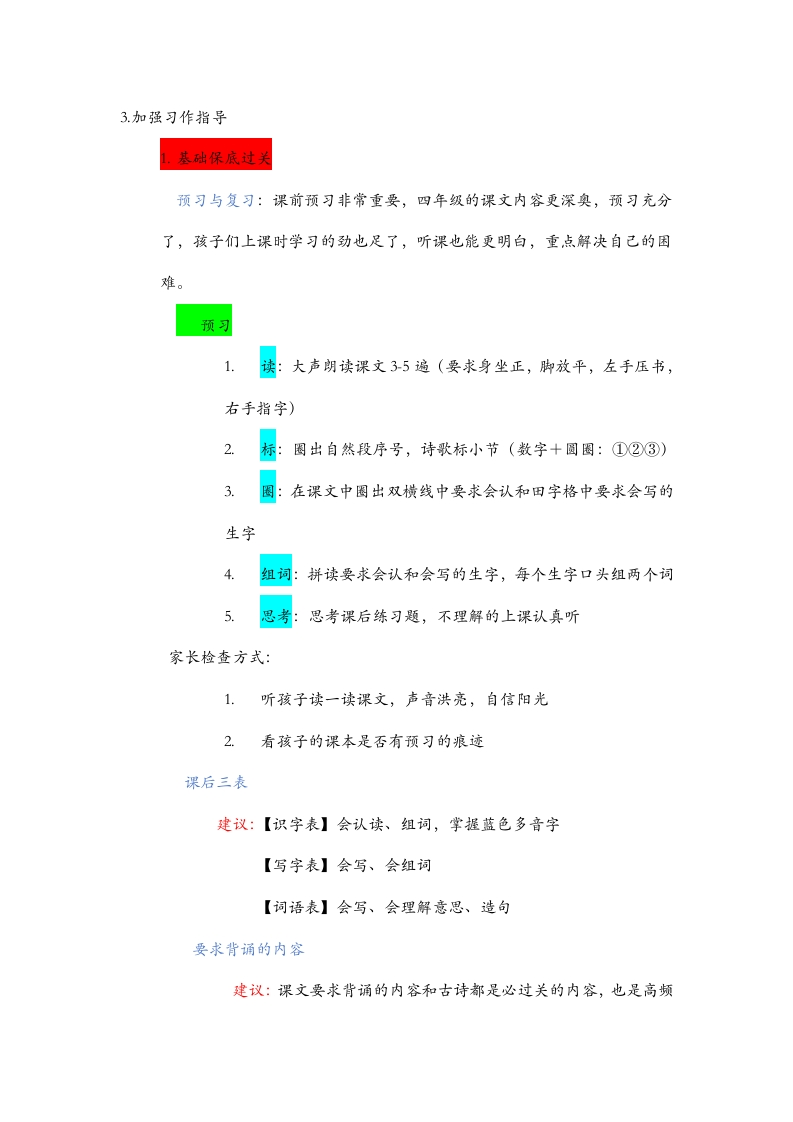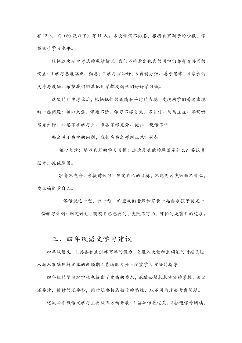 【四年级上】【语文】【期中】家长会:提灯引路,育梦成长发言稿晨晨老师5天前发布关注私信25.15KB11页03411 以下为资料部分截图预览,下载后为超高清原文件。 第1页 / 共11页 第2页 / 共11页 第3页 / 共11页 试读已结束,还剩8页,您可下载完整版后进行离线阅读 加入VIP,享海量教务资料,无限制免费下载所有材料 【四年级上】【语文】【期中】家长会:提灯引路,育梦成长发言稿此内容为付费资源,请付费后查看¥9.9¥15.9VIP会员免费代理(享70%分佣)免费立即购买您当前未登录!建议登陆后购买,可保存购买订单付费资源© 版权声明文章版权归作者所有,未经允许请勿转载。THE END综合资料 文本预览 四年级语文期中家长会各位家长,大家好!首先,对各位家长能百忙之中抽出时间来参加这次家长会表示深深的感谢!召开这次家长会的目的是为了加强老师与家长之间的练习,相互交流一下学生在校及在家的情况,以便我们能够及时调整工作,提高教育教学质量,同时促使家长也能够积极参与到学生的教育管理中来。下面,由我来根据本班的有关情况简要地向家长们做个汇报,从班级学习情况、期中考试情况、四年级语文学习建议、四年级孩子特点、家庭教育小妙招展开:一、班级学习情况1.课堂表现整体情况:1认真听讲;2.乐于回答问题;3.较高的学习热情和参与度表扬:赵、钱、孙、李等同学个别学生情况:1.思想松懈,学习态度不端正;2.上课注意力不集中,听课效果不好;3.自制力差,做与上课无关的事。2.作业表现整体情况:1按时完成作业;2一定的自主性;3.部分同学完成质量高,写字工整,做题有自己的见解。表扬:赵、钱、孙、李等同学个别学生情况:1.作业完成情况差;2.做题习惯较差,字迹潦草;3.不认真完成,应付了事,乱写;4.抄作业问题突出;5.批改后的作业不按要求订正。二、期中考试情况这次的期中考试参与的人数共45人,A(100一90)有22人,B(90一70) 查看更多 收起部分 喜欢就支持一下吧点赞11 分享QQ空间微博QQ好友海报分享复制链接收藏